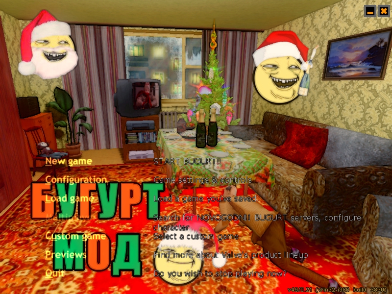НОВОГОДНИЙ HALF-LIFE БУГУРТ-МОД! ДОЛГОЖДАННЫЙ МОД, НА КОТОРЫЙ ВСЕМ ПОХУЙ! ТЕПЛЫЙ-ЛАМПОВЫЙ ГОЛДСОРС @ CHRUSCHEVKA.BSP @ ТАЩИШЬ С БАТЕЙ НИЗКОПОЛИГОНАЛЬНЫЙ СТОЛ @ СМОТРИШЬ ОДИН ДОМА ИЗ ДЕСЯТИ ЗАЦИКЛЕННЫХ КАДРОВ @ НЕСЕШЬ НА СТОЛ SALATIK.MDL @ ИЩЕШЬ ПО КВАРТИРЕ ПОСЛЕДНЮЮ УПАКОВОЧКУ FUNC_MAZIK @ ЧИТАЕШЬ МОНСТРЫ. ПРИВИДЕНИЯ. НЛО С МЫЛЬНЫМИ 512Х512 СТРАНИЦАМИ @ СЛУШАЕШЬ AVARIA_NOVOGODNYAYA.WAV