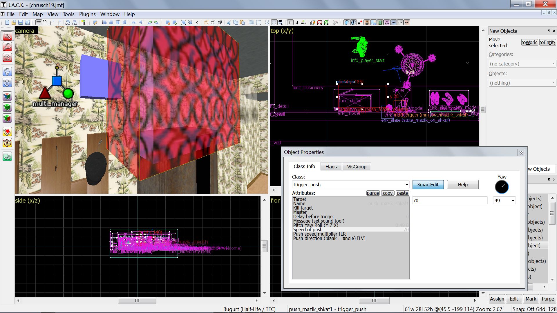 ЧТО? КАКИЕ ЕЩЁ МАТЕРИАЛЫ? ТИХСТУРЫ У НАС ЕСТЬ, 512×512, ДА. НУ А КУДА НАМ БОЛЬШЕ? ВОТ WAD'Ы ОТ МАТЕРИ МОЕЙ ОСТАЛИСЬ, ТАК МЫ ИМИ ТАК И ПОЛЬЗУЕМСЯ, НЕ ПРОПАДАТЬ ЖЕ ДОБРУ @ ЧТО? БАМПМЭПИНХ? ОТРАЖЕНИЕЯ? ТАК В ВАННОЙ ВОН БАХАТОЕ ЗЕРКАЛО ВИСИТ, НУ И ЧТО, ЧТО НЕ ОТРАЖАЕТ, А ПРОСТО ТЕКСТУРА СТЕКЛА, МЫ И ТАК ПРИВЫКЛИ @ ФИЗИКА? НУ ЭТО, СЛАВА, ТОЛКНИ-КА ВОН ТОТ БРАШ С МАЗИКОМ! @ ВО КАК ПОЕХАЛ-ПОСКОЛЬЗИЛ, FUNC_PUSHABLE, ЕЛКИ-ПАЛКИ!