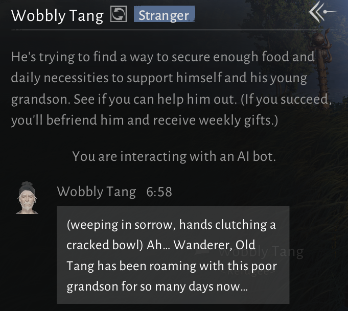 >>50474531 У игры интересный лор и сюжет оказывается, жаль что из-за китайских имён тяжело разобраться. А ещё косяки перевода и самой игры не дают возможности понять всё сразу, я сегодня бля квест проходил но ебаная игра автоскипом мне все диалоги прогнала, из-за чего я нихуя не понял чем он закончился, но в каментах какой-то добрый китаец всё раскидал