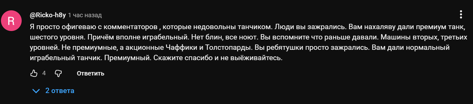 >>50488274 Слушай, давай объясню для отсталых. Представь что ты играешь с 10 года и ты не бомж. Ну то-есть ты бы был успешным человеком, ты донатил, у тебя все было из премов и 10, а не как сейчас, нищий и покупаешь все по акции в чижике и водку марки 365дней. Так вот. Я за 1 бой в день с премом прокачиваю его на 7к опыта. То есть я за год его открою не напрягаясь. Просто катаясь еблом по клаве, взамен, я получу танк с орудием уровня е100 по урону и с башней. Да, пробоя не хватает, но я и так играю на бб, я уже привык к такому пробою + крутанули точность и 10 теперь попадают. Если ты бомж как сейчас, то да, тебе он не нужен бери 57. А если все есть просто неспешно прокачивай и имей урон за 5-7 сек 1800-2700. Давай, не грусти, может перестанешь хуй сосать и жизнь наладится.