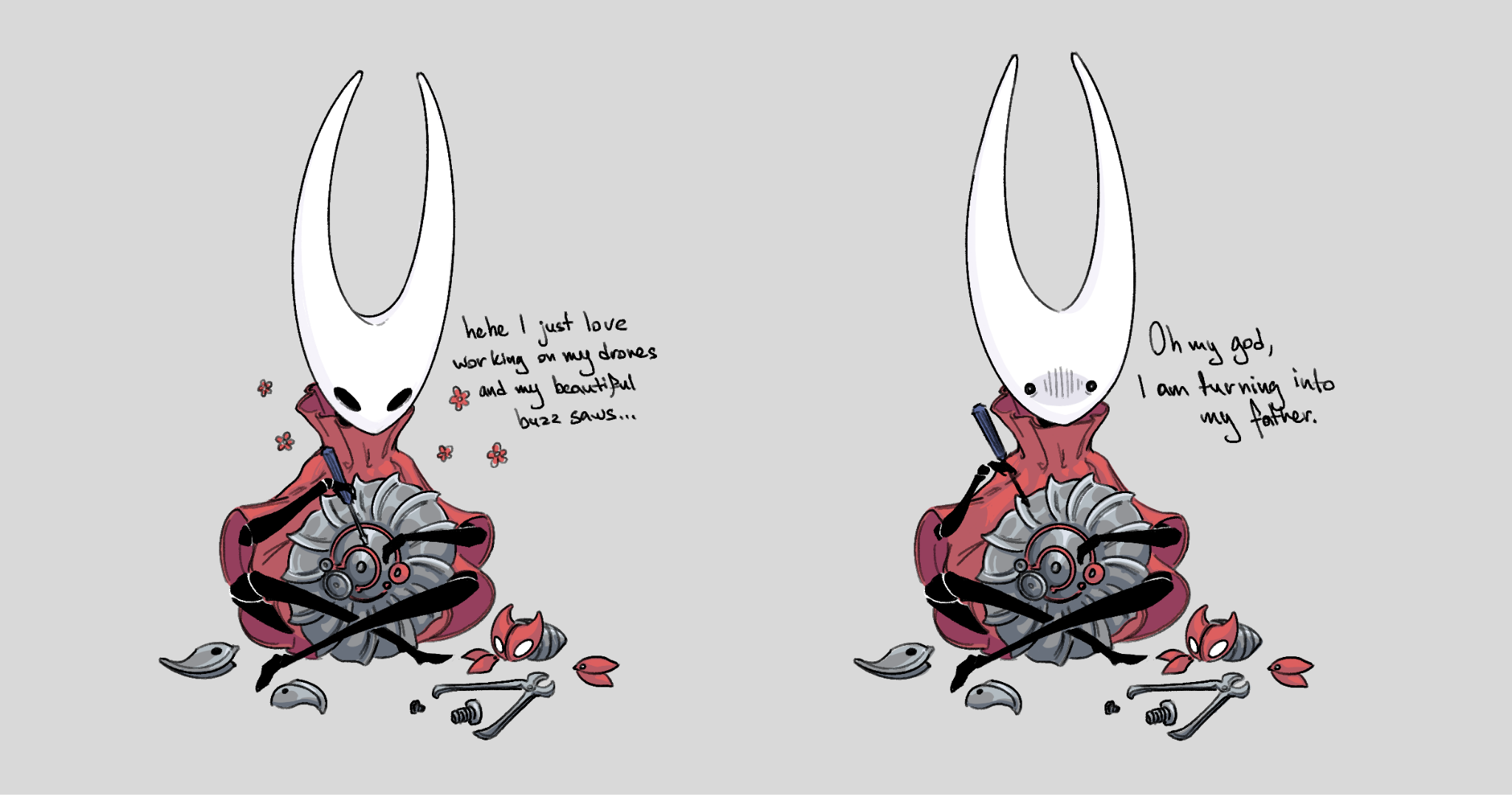 Мдя ребята, первя часть настолько лучше, что даже не смешно. Как будто другие люди делали, настолько связно всё, гладко и интересно. Тут и Квирел тусуется, и Хорнет не для мебели, и Грезящие несколько раз только за начало игры успевают высказаться что они об этом думают. Святилище душ в миллон раз лучше белых покоев. Деревня богомолов в миллион раз лучше пути охотника. Город слёз поменьше цитадели, но воспринимается более внятно. Зачем было проёбывать в силксонге концепт грёз вообще хуй пойми, как так вышло что Хорнет как будто доступа к ним не имеет, хотя собственно Херра грезящая, ну бля.