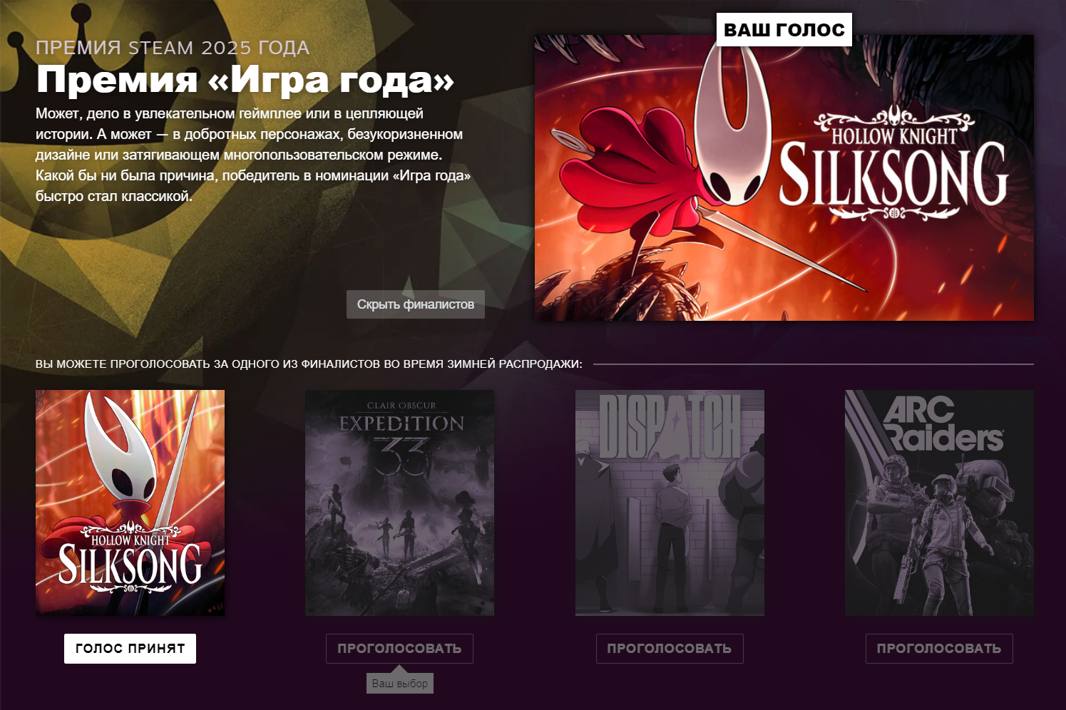 Ещё один последний перекат! Продолжение легендарной метроидвании Hollow Knight. Станьте смертоносной охотницей Хорнет и отправьтесь в странствия по царству, в котором правят шёлк и песня! Путешествуйте по новым землям, открывайте в себе новые способности, сражайтесь с полчищами чудищ и насекомых и раскрывайте тайны, связанные с вашей сущностью и вашим прошлым.