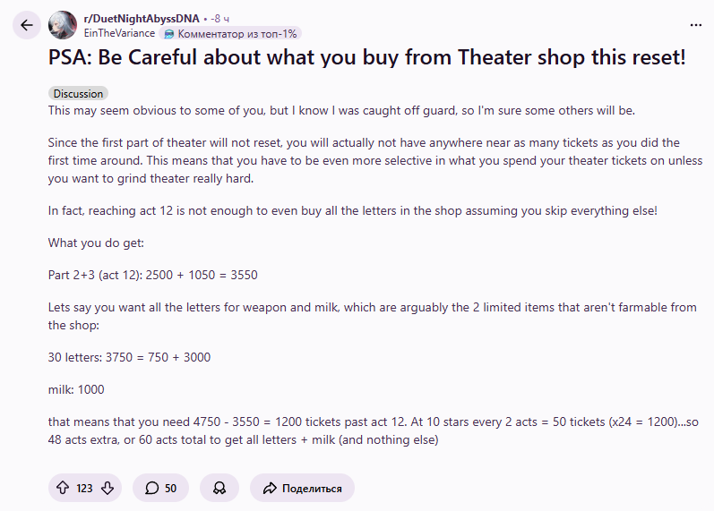 Читал первую часть предстоящего патча Rewards for Floors 13 to 36 of [Immortal Repertoire] in Immersive Theatre have been enhanced. The reward is now increased from [Ticket Stub] ×10 per 2 stars to [Ticket Stub] ×20. Теперь есть больше мотивации доходить до 36 и хуй класть.