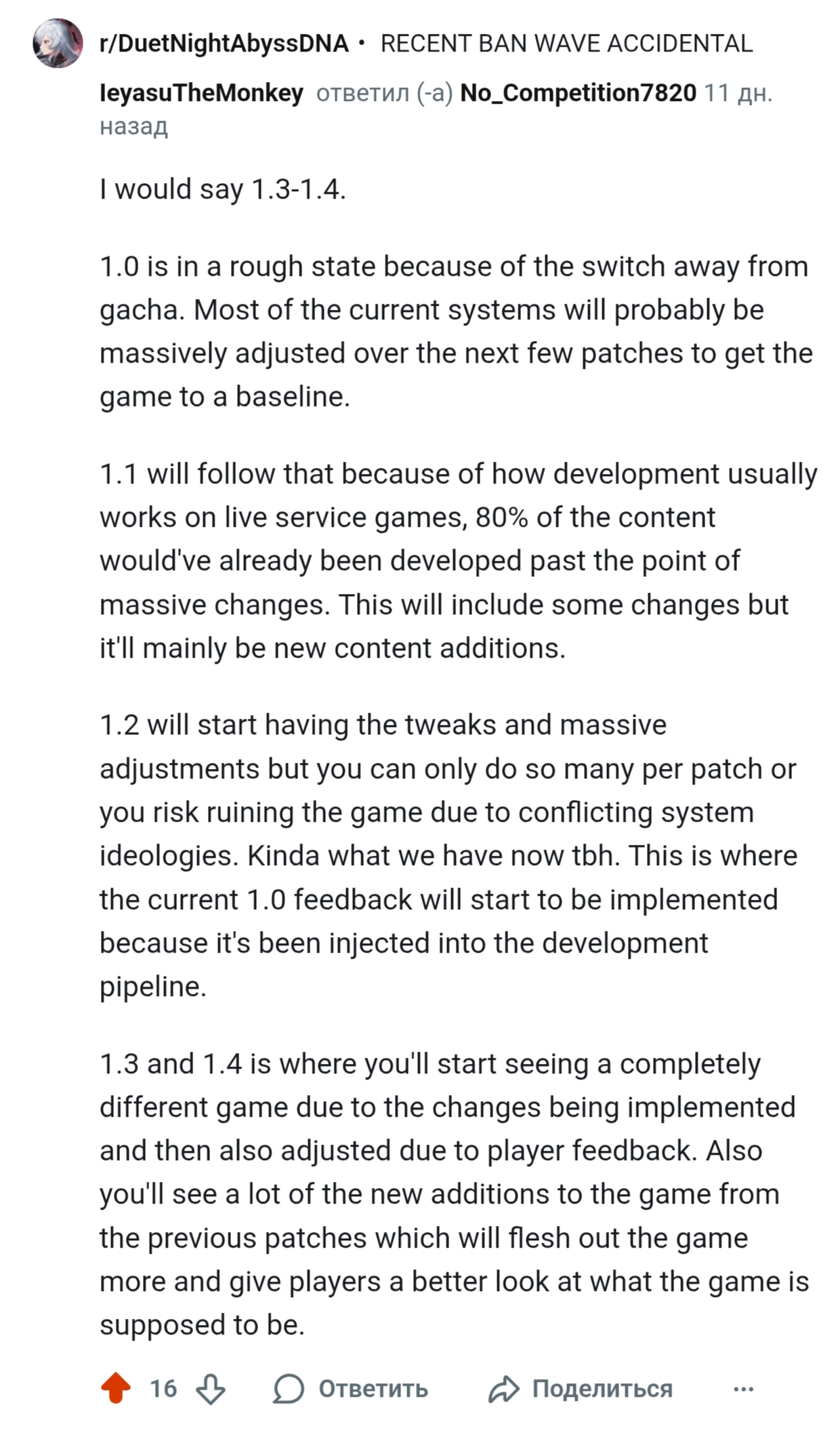 >>50492358 В игре есть листовка, где упоминаются баги, которые сейчас есть в игре (типа того, что на медуз ребекки не работает баф от уровня триал ранга с увеличением АТК) и которые планируется пофиксить на релизе 1.1, это ориентировочно после того как закончится нынешний театр, конец декабря. По роадмапе - https://x.com/DNAbyss_EN/status/1990721699721908598 В том же треде >>50456762 → всё из важного перечислил. По сути 1.1 будет той же игрой, но с фиксами и qol улучшениями в нескольких местах (новые оружку, персов, веджи и костюмы не упоминаю), но кор геймплей с механиками останется тот же. В совокупности абсолютно понятно почему люди уходят или скриптят, но непонятно почему другие набрасываются в защиту игры так яростно. Надеюсь там хоть задоначено в районе 200$+, чтобы оправдать такое брюзжание.