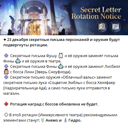 ✦ 23 декабря секретные письма персонажей и оружия будут подвергнуты ротации.