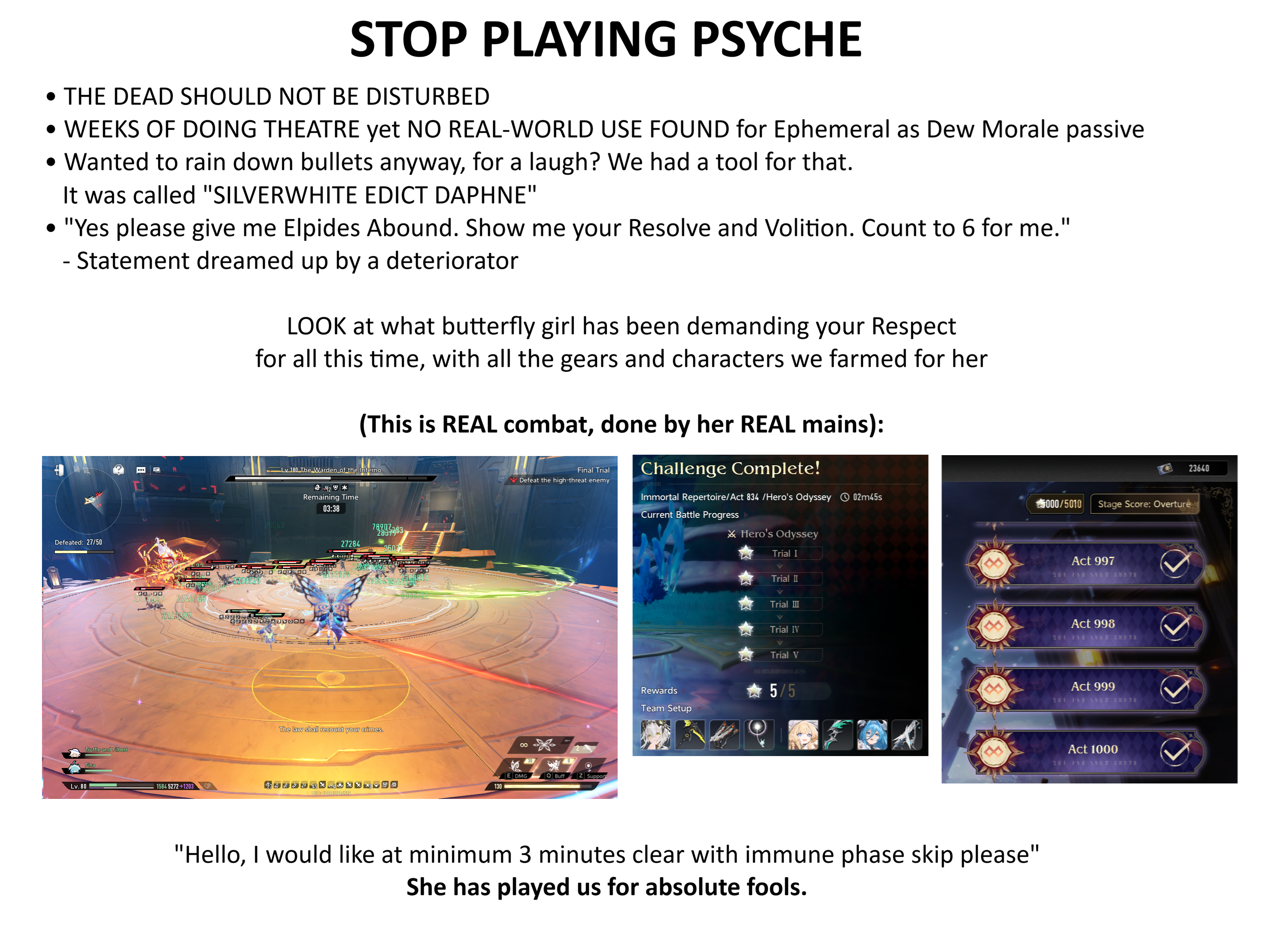 Что то невижу смысла кого то еще играть если есть Писипея челы, прям универсалка на любой тип миссии. Даже в афк говнине можно ее ботом поставить и она там бабочками так же все аннигилировать будет пока афкаешь. Когда то давно задумывался о с6 леди милфе но прикинул сколько забегов на это надо сделать чтоб ее потом на условную оборону разве что таскать и приуныл. В др режимы я тупа невижу смысла никого кроме бабочки брать... а еще скин на псайки так и не падает овари да