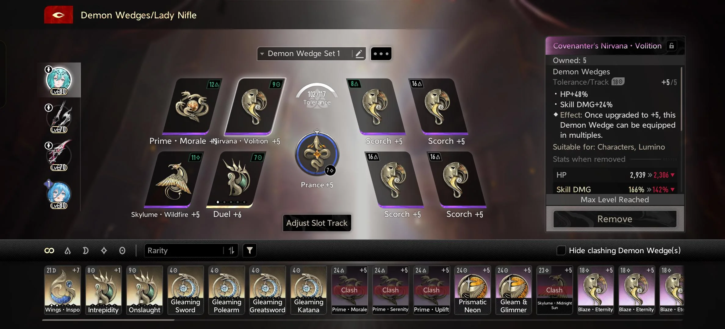 Cleared all of the theatre till IR act 12 with i6 lady nifle/i2 fina/i0fushu(i1 after Act 7). All of them are with purple wedges except wings inspo +7 on sups and duel +6 on nifle-sama. Both weapons on lady nifle are smelt 5.Others are smelt 0.Tbh the weapon skill dmg buffs get diluted heavily by the fushu skill dmg buffs. Skills are all 8 on supports and all 10 on nifle-sama.