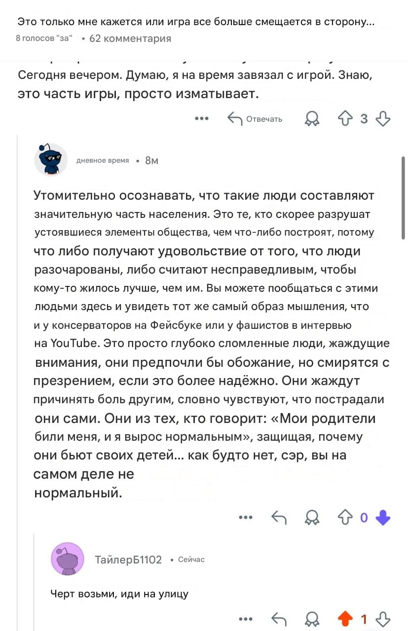 >>50487780 С одной стороны пиздатая игра, в которую приятно играть, стрелять, исследовать карты, выполнять задания и собирать разноцветный лут. С другой стороны постоянный стресс от осознания того, что в любой момент тебе в псину прилетит пуля и твое время будет потрачено впустую. У большинства людей психика не видит разницы между реальностью и игрой, и они переживают реальный стресс, который может реально сказаться на здоровье (давление, сердцебиение и тд). Поэтому нормальным людям (не психопатам) хотелось бы, чтобы таких ситуаций, где их обманывают/унижают/подстерегают было как можно меньше, тем более, когда убийство другого игрока - это не вин кондишен. Ты можешь получить то же самое с мобов и лутинга, никакого уникального лута игроки не дропают, опыта за убийство дают не сильно больше, чем за шершня. При этом ты сам подставляешься под агрессию со стороны третьих игроков, которые тебя завалят с чувством удовлетворения как поехавшую псину. Тебе просто дают возможность стрелять по игрокам, а делать это или нет - сугубо личный выбор каждого. Тех, кто выбирает насилие, в обществе не любят.
