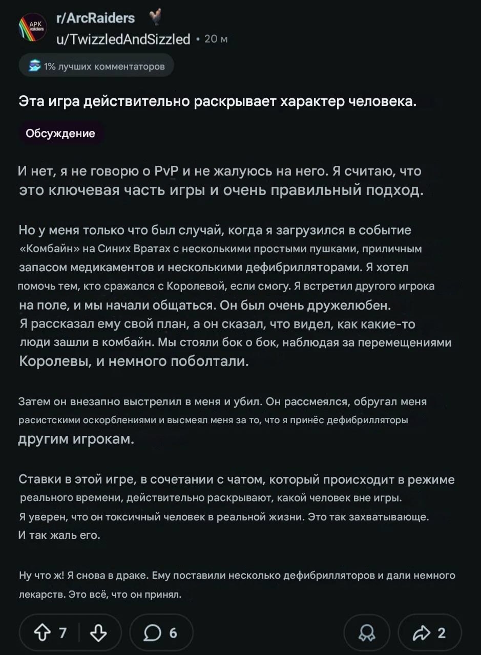 Я конечно в ахуе со сценариев в этой игре. Помог этому райдеру с Бастионом, дабы он его не убивал пол года, побежали на выход вместе и меня подстрелил ракетчик под конец. По итогу этот рейдер сначала пытался с двумя игроками договориться на счёт дефибриллятора, но они уехали на поезде и он вернулся ко мне, дабы похилить, потому что была возможность дождаться поезда. Вскоре я обнаружил, что он у кого-то просит дефибриллятор, поворачиваюсь, выхожу из укрытия и отправляюсь на могилу. Десять из десяти на кончиках пальцев.