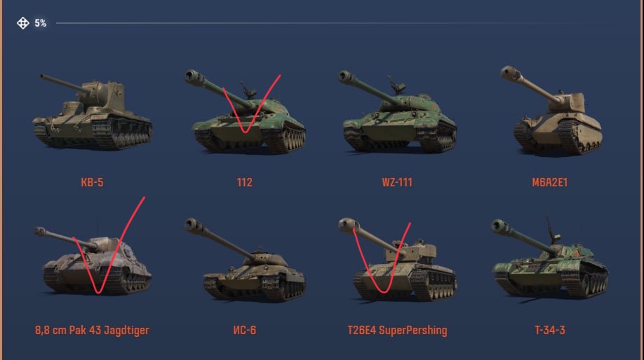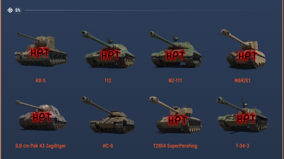⚡️Льготная техника — 8 машин, для которых были предусмотрены индивидуальные настройки балансировщика: VIII КВ-5, VIII 112, VIII WZ-111, VIII M6A2E1, VIII 8,8 cm Pak 43 Jagdtiger, VIII ИС-6, VIII T26E4 VIII SuperPershing и VIII T-34-3. Вероятность выпадения — 5%.