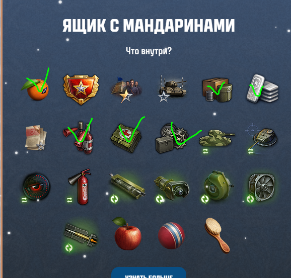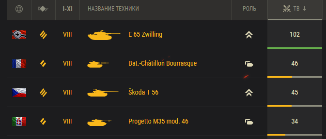 💪 Легенды — 6 редких танков: VIII Škoda T 56 , VIII Bat.-Châtillon Bourrasque , VIII Panhard EBR 75 (FL 10) , VIII Progetto M35 mod. 46 , VIII ELC EVEN 90 и VIII Turtle Mk. I . Вероятность выпадения — 5%.