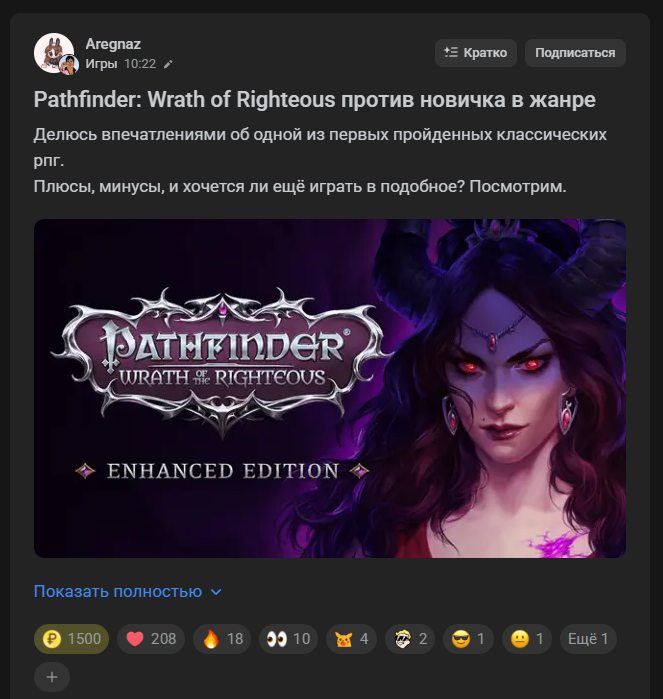 Pathfinder: Wrath of the Righteous В основном тот же Kingmaker по механу, но используемый набор модулей Wrath of the Righteous. Деус Вульт! Возьмите под контроль армию крестоносцев и отправьте демонов обратно в Бездну. Одна из основных механик — мифические пути. По одному на каждую ячейку алаймента. Можно стать Ангелом и нести бобро и свет, Демоном-психопатом, космическим судией Эоном, Азатой-хиппи-анархистом, социопатом-Личом, Трикстером-петросяном (шулерить к дайсам и пробивать 4 стену), золотым Драконом, злобным и ехидным законником Дьяволом, суперменом-Легендой или ебануться насовсем и стать абсолютным злом, от которого с визгом убегают даже демоны — Шагающим Роем. Купить: https://hobbygames.ru/key-pathfinder-wotr Скачать: https://rutracker.org/forum/viewtopic.php?t=6104067