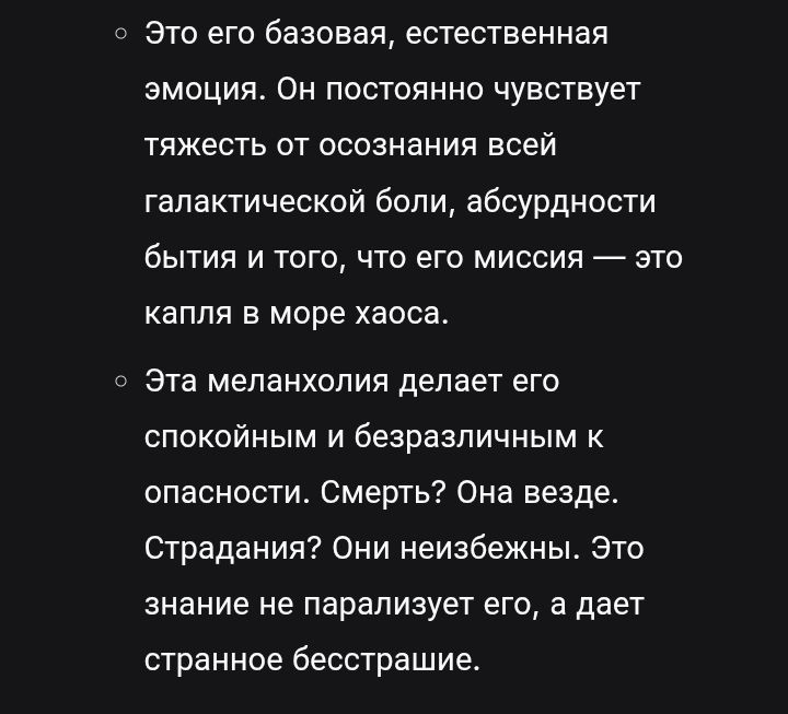 >>50493394 >позорных дефолтных Ну не надо, не такие уж и позорные. >>50493408 >>50493369 Да мне норм так то. ГД значительно отличаются мышлением от смертных так что норм. Хотя у ГД должен был быть такой же вариант как у демона только [ПУТЬ ДРАКОНА] РЫЧАНИЕ ДВИГАНИЕ ТАЗОМ/МОЛЧА ОСУДИТЕЛЬНО С СОЧУСТВИЕМ СМОТРЕТЬ Так то даже присутсиве гг должно молча решать вопросики. >>50493409 >еретик Однозначно должен меняться, варп в большом количестве пидорасит. Как я уже говорил, архенту в берсерка кхорна корраптить, Равора и Кассию сращивать с кораблем.