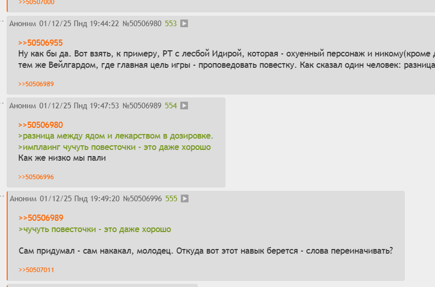 >>50512440 И это меня несказанно бы радовало, живи я в Бельгии. Можно было б в БГ3 эскапизм от реальности устраивать, лол. Но, увы, сравнивать приходится с местными процентами. >>50512441 И у большинства из этих 500 всего две фразы, но даже в них умудряются про свою АБВГДшность заикнуться в разговоре с, на секундочку, первым встречным. Выглядит настолько наигранно и чужеродно, что аж знаменитая сценка "ай эм нон-бинари" из Вейлгарда вспоминается.