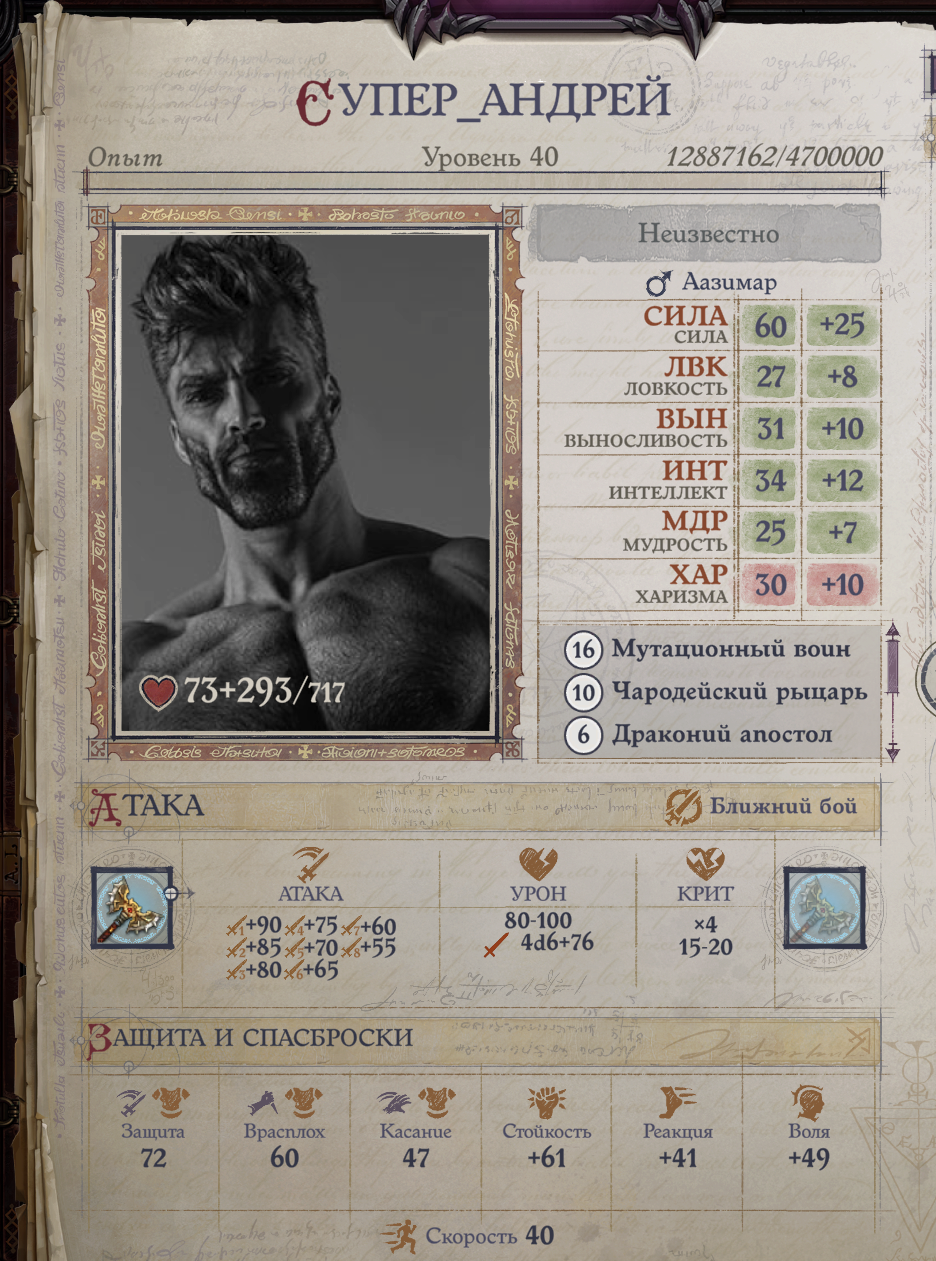 >>50495992 >>50495998 А я на тот момент не сталкивался ни разу с отрицательными уровнями и не знал что нужно быть к ним готовым, и там возле Дрездена есть какая-то сайд локация, не помню название, я туда зашёл, а там какие-то мудацкие синие призраки, ходят первые, тут же срут отрицательными уровнями и главный их ещё каким-то аое меня ваншотит практически. Я понимаю, что сейчас эксперты по пф меня говном закидают, но я впервые в такое играл, естественно билд у меня хрен пойми какой, но до этого хватало везде (воин двуручник с молотком). Да, если это важно, то я хотел не мегаварвара отыграть, а чувака, который просто работает кузнецом с пикрил аватаркой.