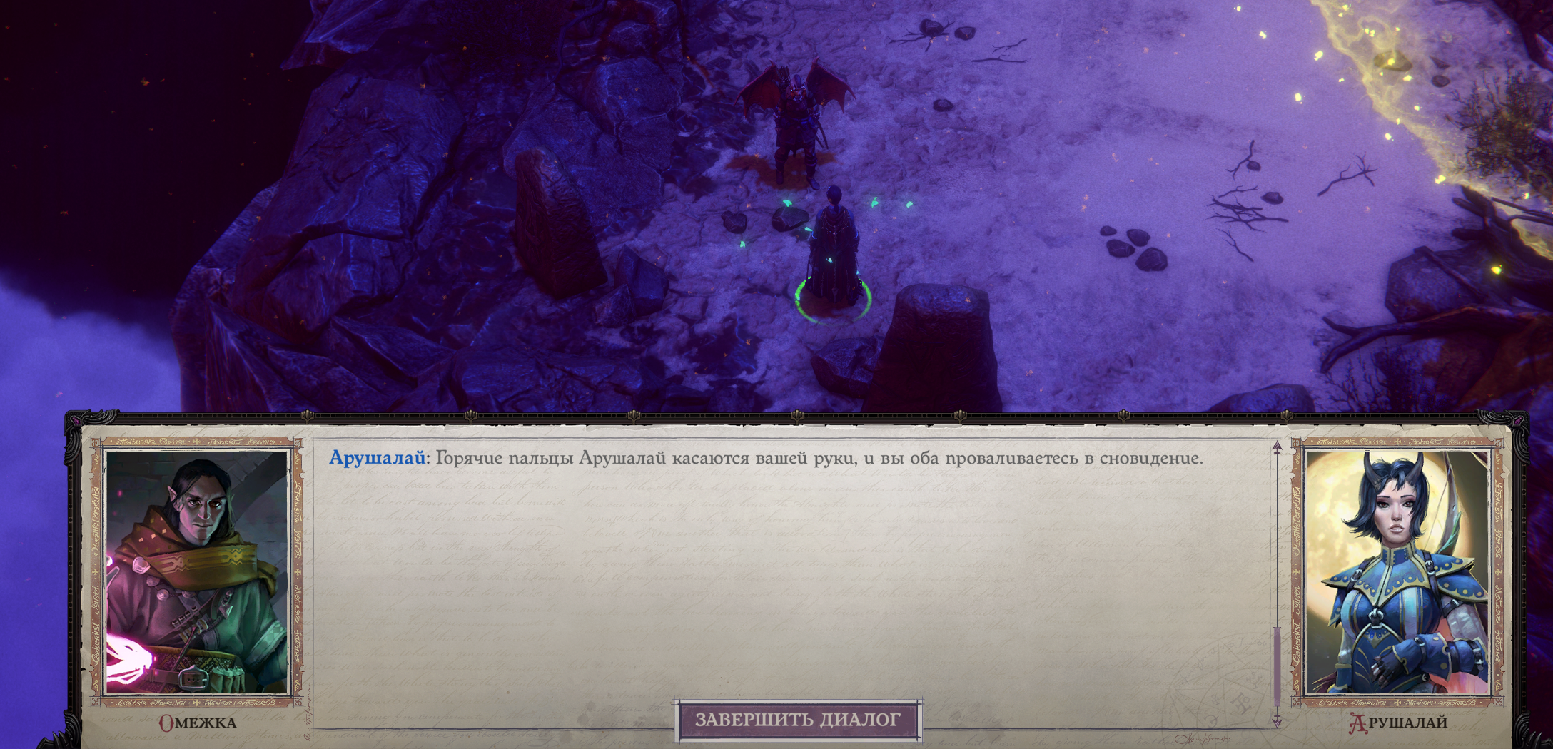 >Чудовище исчезло, и вокруг вновь стало тихо. На столе поднимается пар от свежего печенья и ароматного чая. Арушалай окидывает свою мечту взглядом. Вы никогда не видели на ее лице такой радости. "Я... Просто хочу жить здесь, в мире смертных. С тобой. Я разгадала загадку богини. Вот моя настоящая мечта!"
