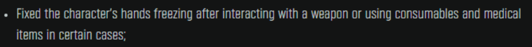 - баг с ошибкой удаления лота с Барахолки так и остался в игре, если выйти со страницы "мои лоты" и не досмотреть как таймер кончится - лот будет висеть как активный. - всё так же нельзя блять в поиске писать больше чем 16 символов, с чем это связано хуй пойми. - ящик на Берегу в хибаре с лодкой всё так же исчезает если к нему не подойти вплотную - в убежке все так же прицел на ПКМ какого то хуя в 3 метрах от тебя визуализируется. - боты всё так же идут сквозь двери если ты стоишь за дверью. ДОКОЛЕ?