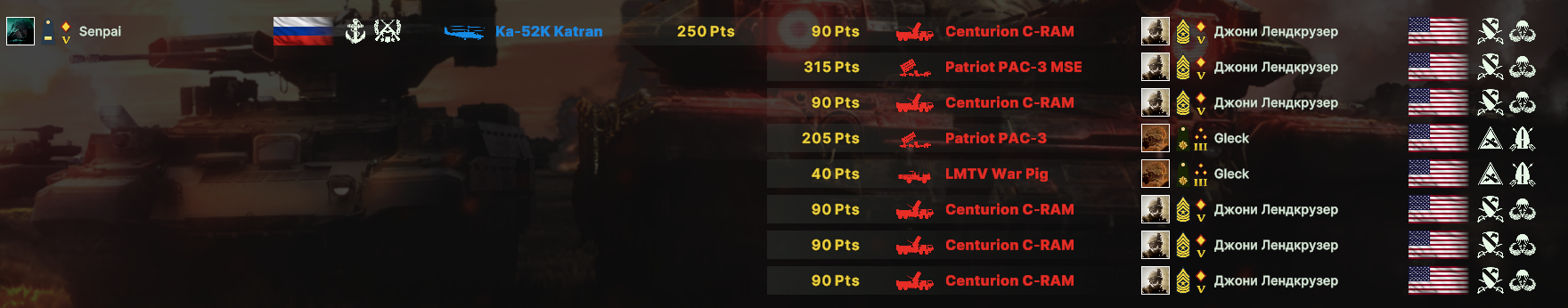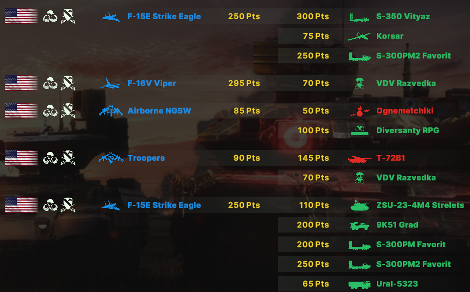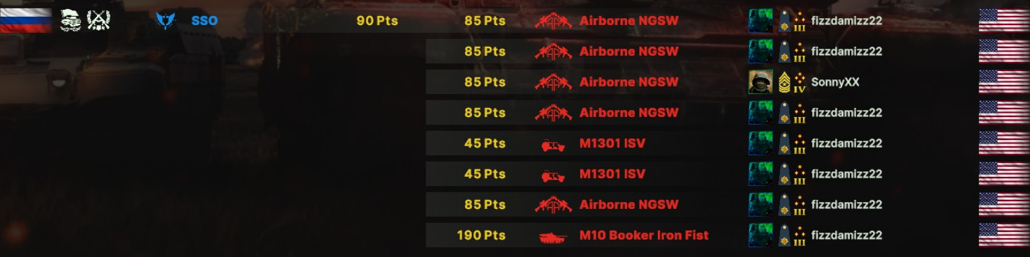 Калининград за США просто топовая карта. Составляющие победы: 1) мы убили вражеское воздушное развертывание, а ядерка никого не смогла завалить 2) всю игру снайпер сидел в лесочке возле самолетного респа, и палил вылеты вражеской авиации. Прикол в том, что он сидит на самом краю карты в лесу, который НЕ ПРОСВЕЧИВАЕТСЯ если мимо него проехать. Нужно подобраться к снайперу прямо в упор, чтобы увидеть. 3) 4х F-15C Eagle. Эта хрень за 220 просто летает на низах с моей стороны реки, а как только становится виден самолет или дрон быстренько подлетает и пускает пару ракет. Также можно попытаться потом забрать какой-нибудь стратег, если он успел отстреляться. 4) В этой деке Танко-ВДВ есть не только саппорт, какой-никакой воздух, саппорт, разведка, но и танки вместе с очень дешевым транспортом: в М113 влазят не только Айрборны (взял всего 1 раз за игру), но и обычные американские механы + оружие поддержки. За 155 денег можно взять коробочку, пехотинцев/штурмовиков + расчет TOW или стингеры. Сама коробочка достаточно жирная и как не странно быстрая 70 по дороге и 55 по земле.