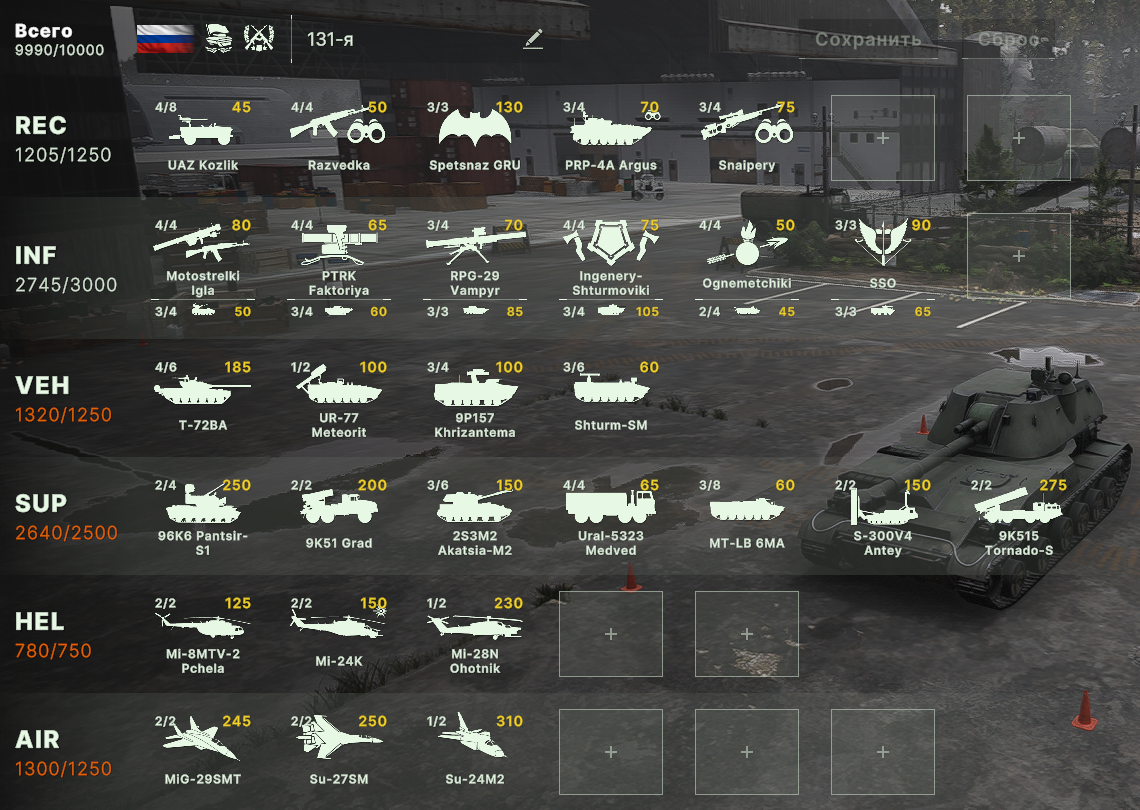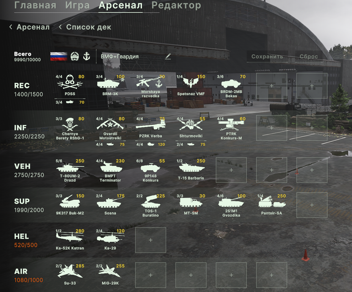 >>50582428 >>50582428 Я себе собрал сборку Танки + Морпехи (аля "сороковка"). Последние бои на ней выигрывал через постоянную агрессию. Из плюсов много как дешевых юнитов, чтобы оказывать постоянное давление, так и достаточно хороших по цене/качеству. Из йоб деки: - это Ка-52 с Гермесами, если бы было нормальное снабжение на грузовиках, то взял бы два. А так приходится держать ка-29 за тучу очков, чтобы подвезти 3 тонны саплая. - Куча Конкурсов - Довольно удачные Т-80 с казами, но не за сотню денег.