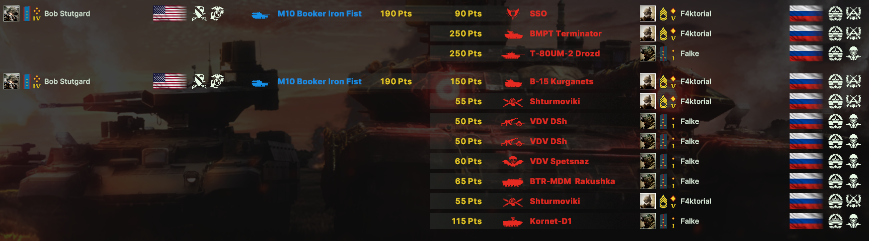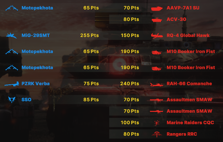 Для меха-мото у меня есть такая 131-я бригада, но с некоторым включением более позних юнитов. Дека хорошо себя показывает в обороне. Наступать не всегда получается. На скриншоте стоял в центре против обезумевших накатов морпехов и ССО США от трех игроков. По итогу мы выиграли намолотив врага и удержав больше точек.