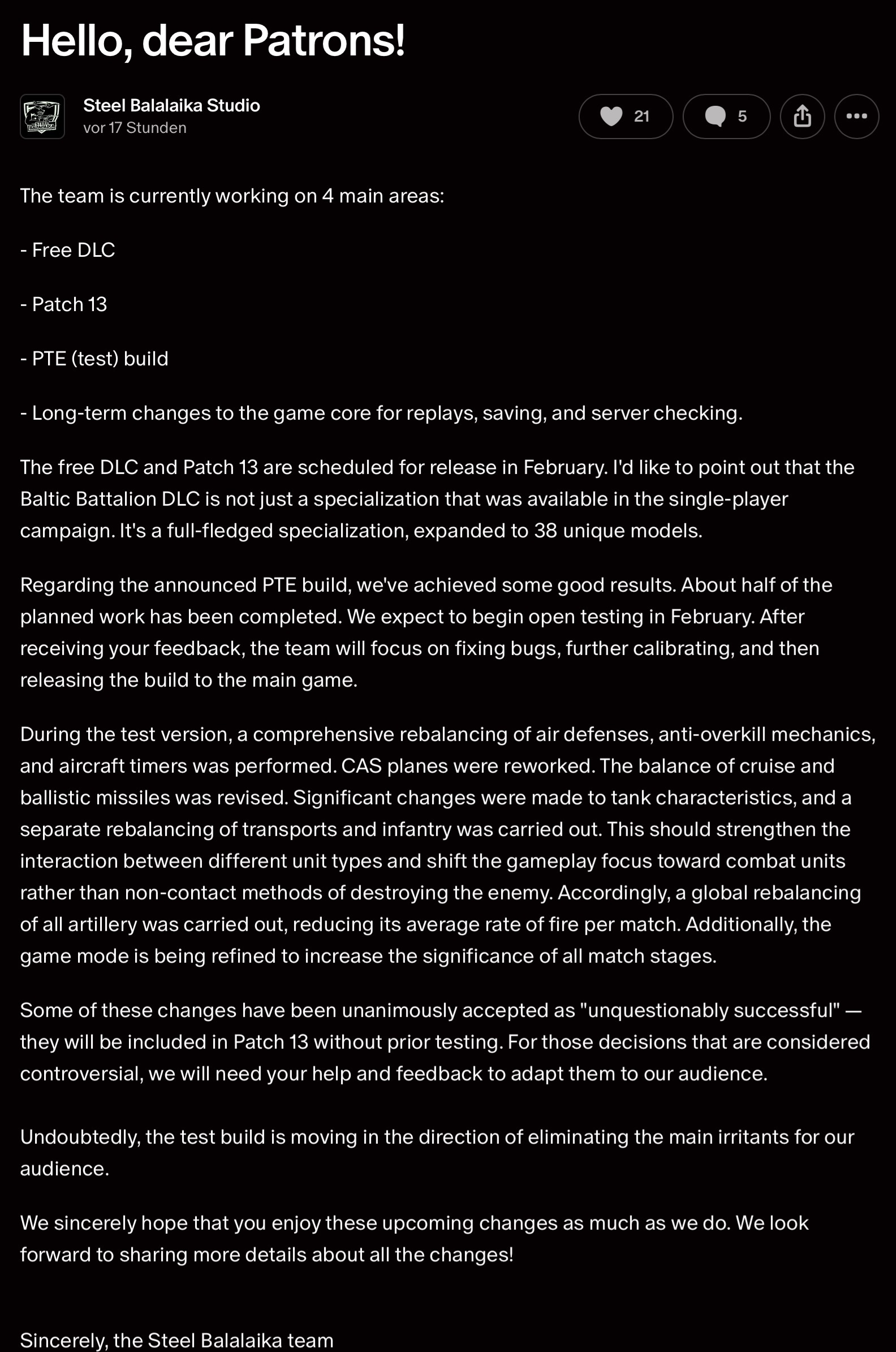 25 ноября презентовали карту развития проекта. Выглядит не особо мощно. Просмотр реплеев не стоит ждать раньше 2026. В следующем году выйдет и первая новая специализация - "Союзники США". Потом появится еще по одной специализации за РФ и США. Однако полноценное дополнение с новым театром военных действий и стороной конфликта выпустят только в 2027, тогда же добавят и "Союзников России" - надеюсь это будет Северная Корея. Ссылка на более подробное описание: https://store.steampowered.com/news/app/1604270/view/596292007595345969?l=russian Запись презентации: https://www.twitch.tv/videos/2627717698