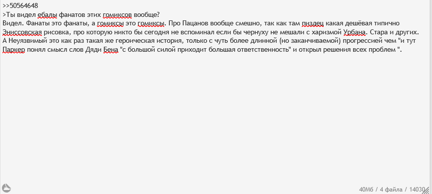 >>50595392 Могли хоть кого-то убить и сделать битву менее масштабной нахуя эта толпа ботов вокруг, все друг дружку пинают бьют кулаками вместо расчлененки, если уж показывают сиськи сексы письки то зачем себя сдерживать в жестокости? Зачем в этой драке вообще феномэн, он безболезненно танчит любой удар этого паучка и сам в состоянии его поднять и швырнуть на несколько сот метров. По хорошему его бы могли не показывать и к примеру под конец заварухи задаться вопросом где он, а какой-нибудь сверхзлодей над Пологом промыл мозги этому пришельцу и взял к себе. Короче масса вариантов как продумать это дерьмо менее нелепо чем сейчас, я не сценарист, не писатель, но даже мне с дивана виднее что 100% могли сделать лучше, а все ровно решили покормить дерьмом как-будто так задумано.
