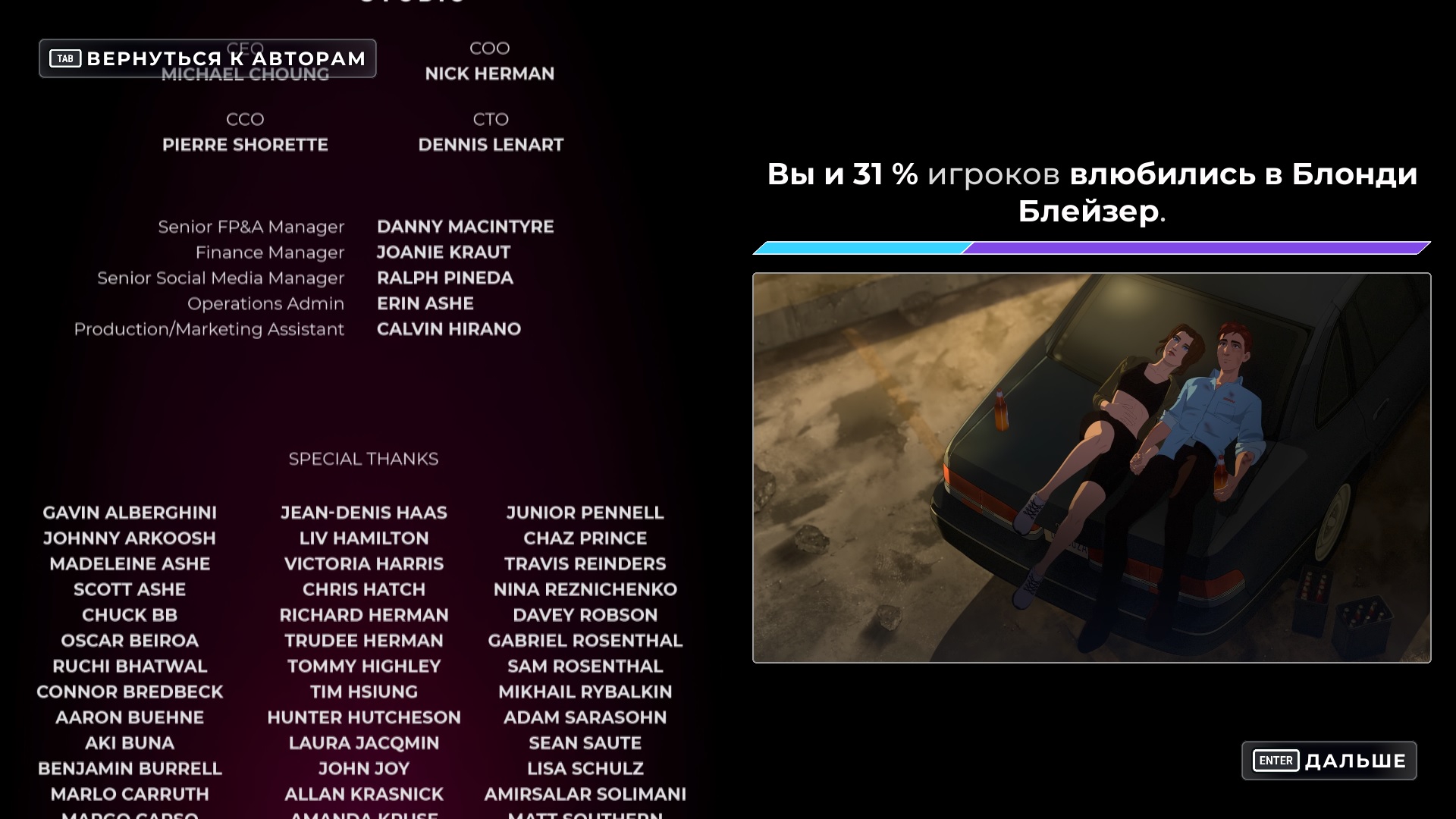 >В процессе второго прохождения, я разобрался как там устроено построение единственного сценария и система выбора в диалогах и просто ахуел. Ого, тогда ты очень умный, и мы хотели бы от тебя простыню аналитики почитать.