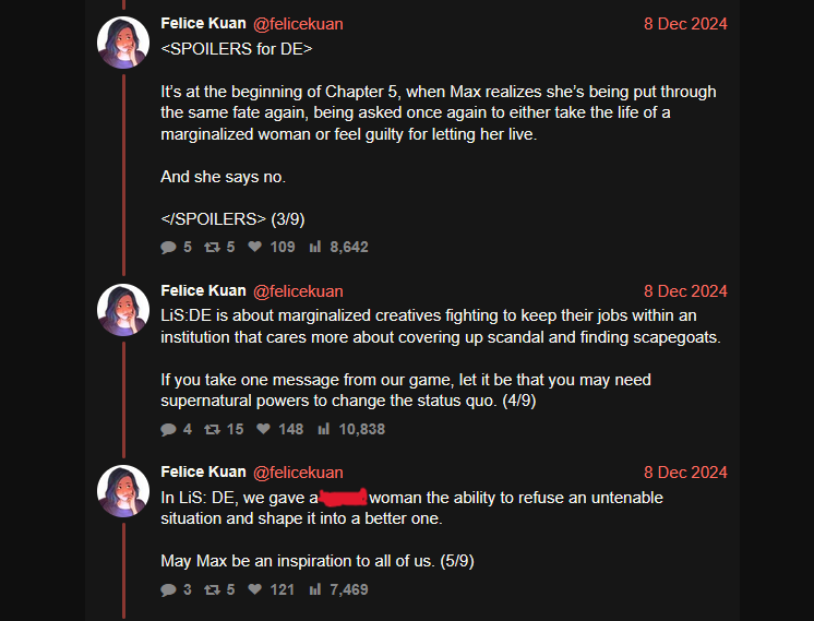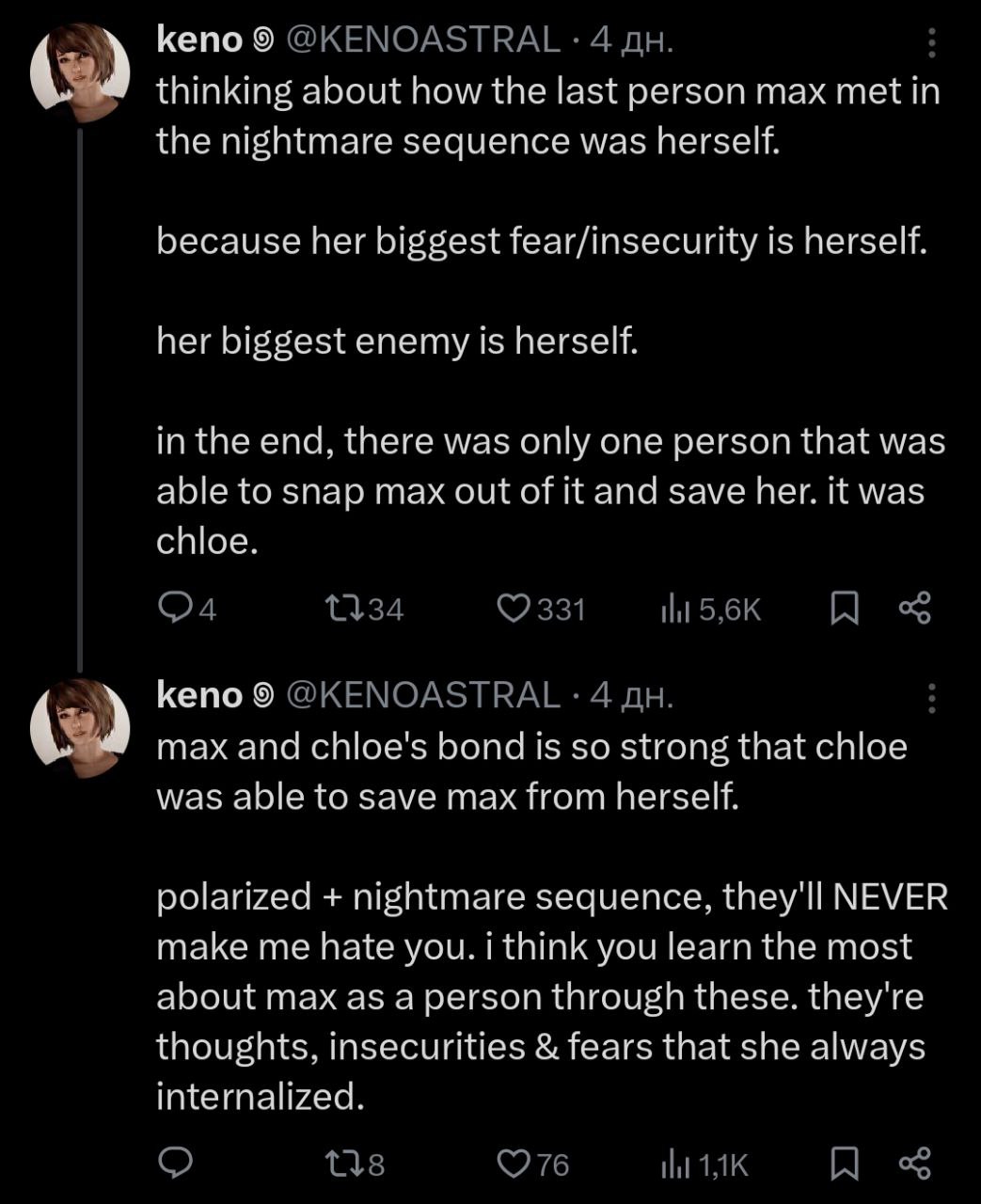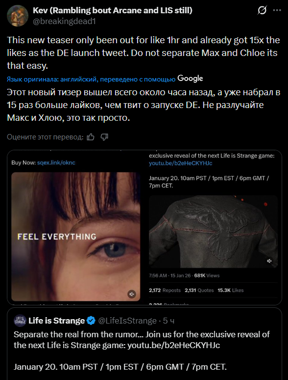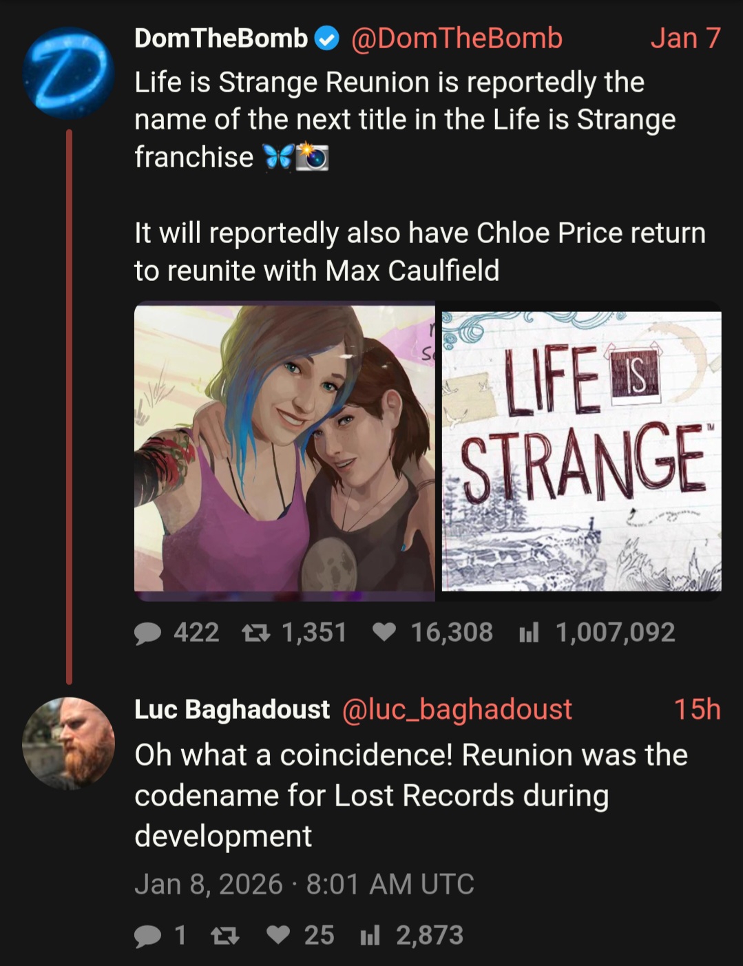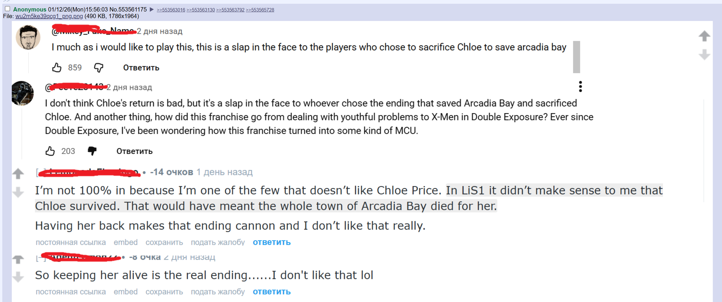Тред посвящен культовой серии игр "Life Is Strange", разработанных студиями "Don’t Nod" и "Deck Nine" и выпущенными издательством "Square Enix", и их духовному наследнику разработанному студией "Don’t Nod" - "Lost Records: Bloom & Rage".