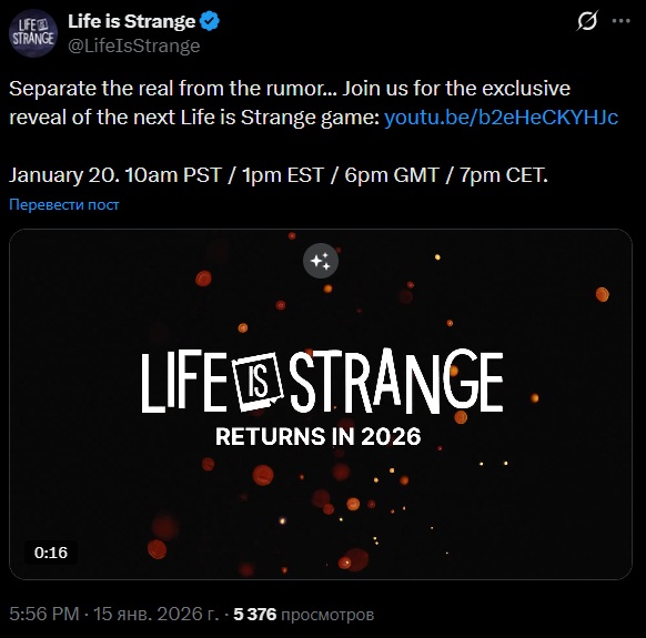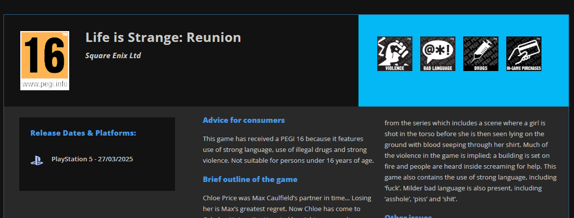 Страницу Life is Strange: Reunion на сайте рейтингового агентства PEGI заметили вечером 8 января. Помимо возрастного рейтинга «PEGI 16» и неверной даты релиза, указывающей на уже прошедший 2025 год, на странице есть синопсис сюжета Reunion. Согласно описанию, в игре должна вернуться Хлоя Прайс, которой нужна помощь Макс Колфилд, однако последняя уже разбирается с другим кризисом и пытается предотвратить пожар, который уничтожит университет через три дня.