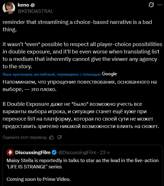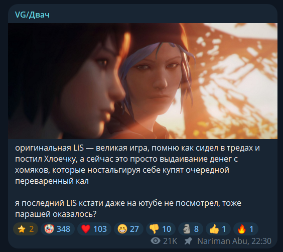 В первой части мне нравилось, что повестку нехуя не пихали никакой и даже намеков на лесбиянство не было до последней сцены. В новых же лайф ис стренжах повестки овер дохуя