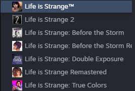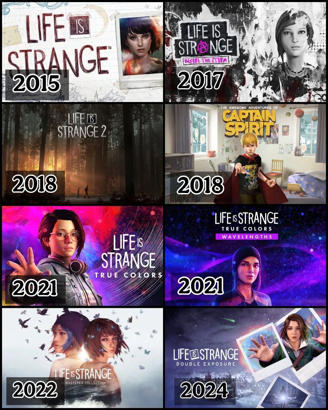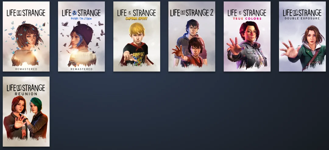 Серия "Life Is Strange" включает в себя: "Life Is Strange" (2015), "Life Is Strange: Before The Storm" (2017), Приквел/Тай-ин к "Life Is Strange 2" - "The Awesome Adventures Of Captain Spirit" (2018), "Life Is Strange 2" (2018-2019), "Life Is Strange: True Colors" (2021), "Life Is Strange: Remastered/Arcadia Bay Collection" (2022), "Life Is Strange: Double Exposure" (2024) "Life Is Strange Collection" (2025)