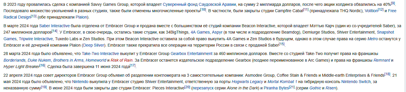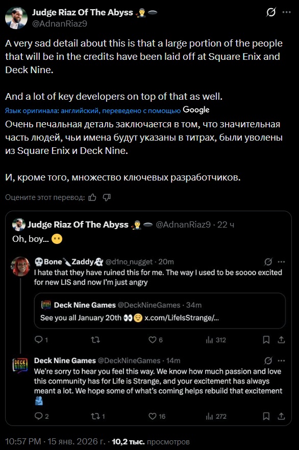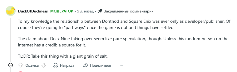 Ну и в качестве вишенки на торте - то, о чём я и говорю >Сотрудникам иногда приходилось работать по 70-80 часов в неделю >Переработки во многом были связаны с давлением Square Enix, которая ставила жёсткие сроки и старалась как можно сильнее сократить бюджет >Работники жаловались на низкие зарплаты, трудности с карьерным ростом и бездействие руководства в отношении случаев токсичного поведения >Сотрудники Deck Nine винили в сложившейся ситуации руководителей самой студии