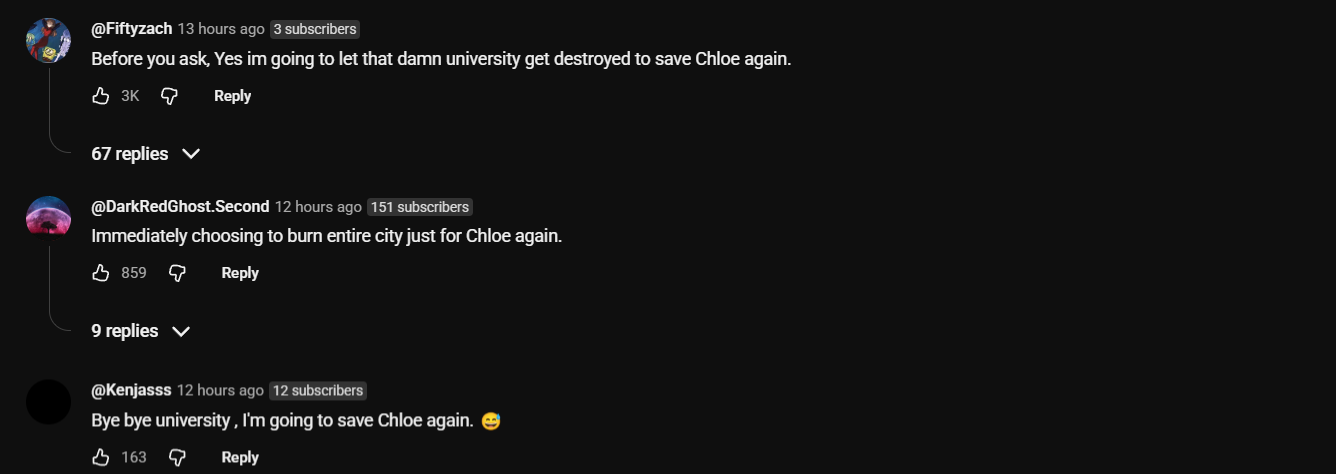 Ну вот мне не очень нравится что они начали штамповать идеи из игры в игру, то есть я понимаю там в предыдущей игре был шторм тоже, и убийство лучшей подруги, типа это была такая метаирония на первую игру, ок. Но бля опять "шторм" (пожар, один хер), опять "невозможный выбор", всё одно и тоже млять, нахуя? Во второй игре была другая формула, в приквеле тоже, в цветах тоже. А тут уже третья игра и всё одно и тоже, задрало. Могли бы чот новое придумать. Я ещё после предыдущей игры вот эту ждал, потому что думал что ну всё, формулу первой повторили, теперь надо что-то новое придумывать для следующей части, но хер, лол.