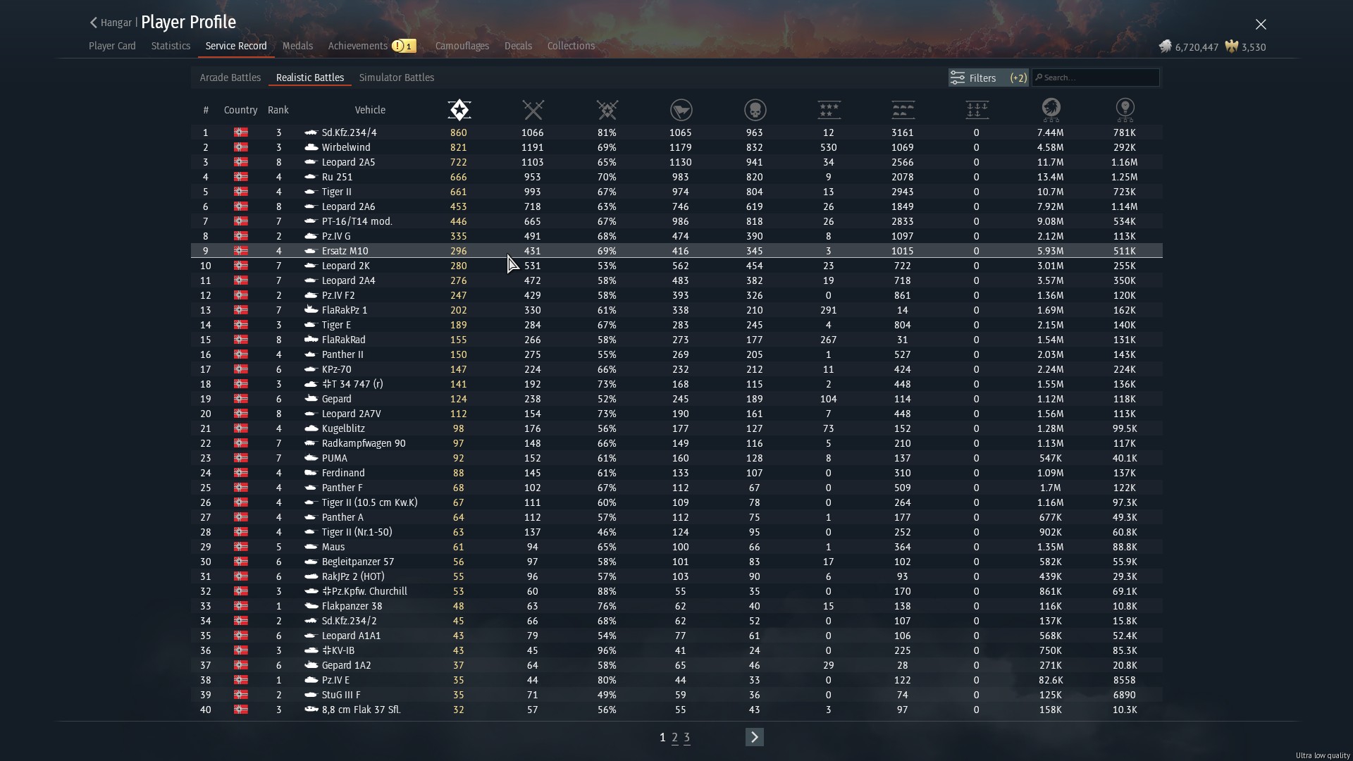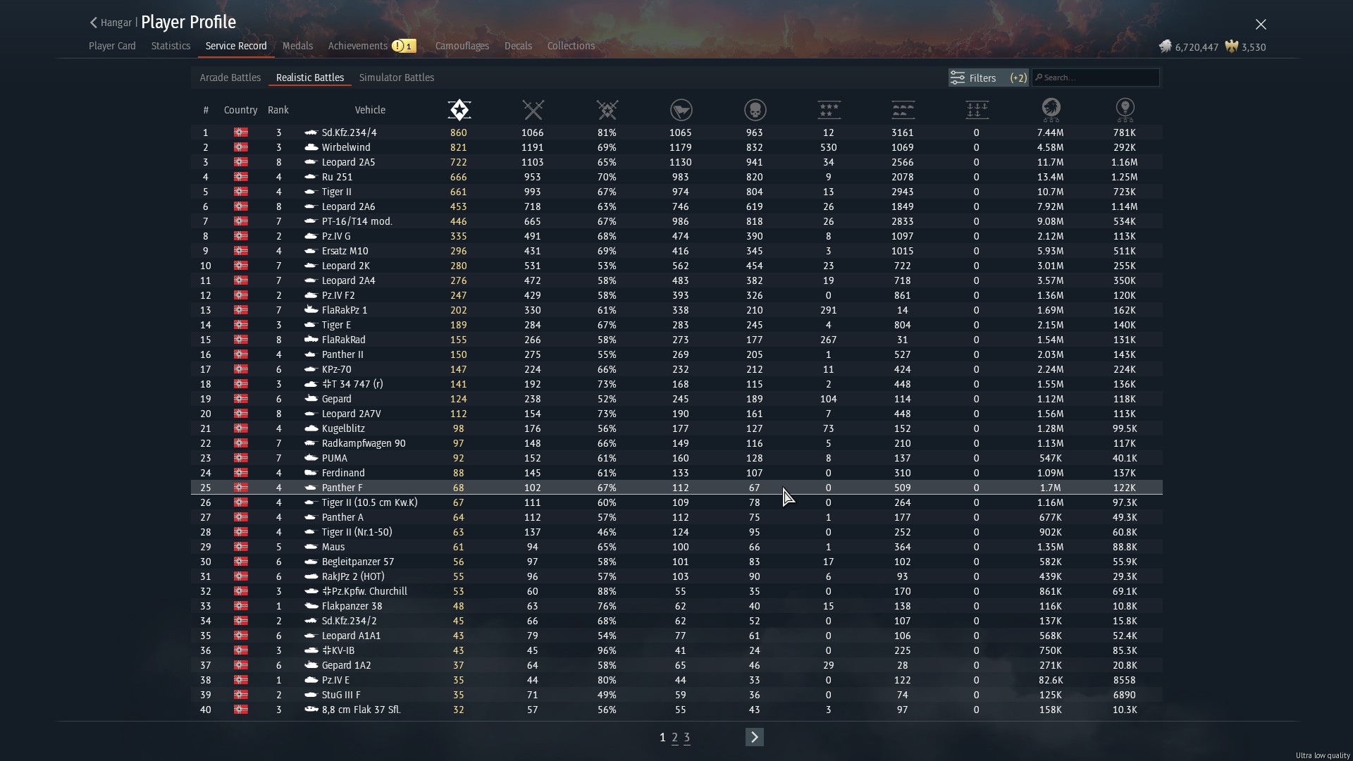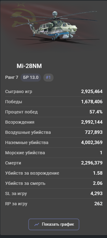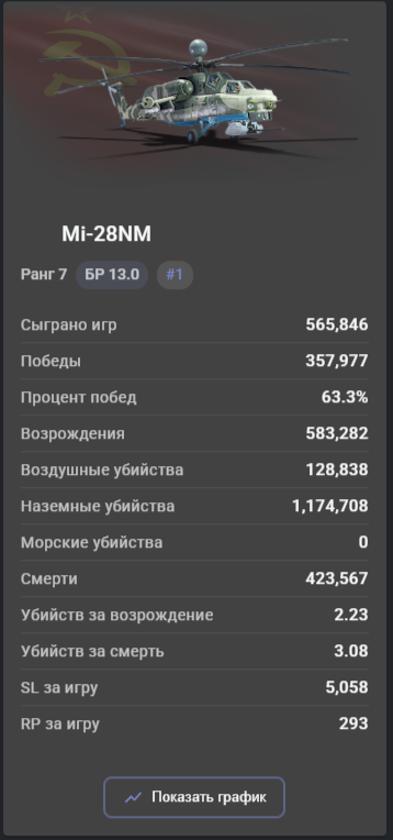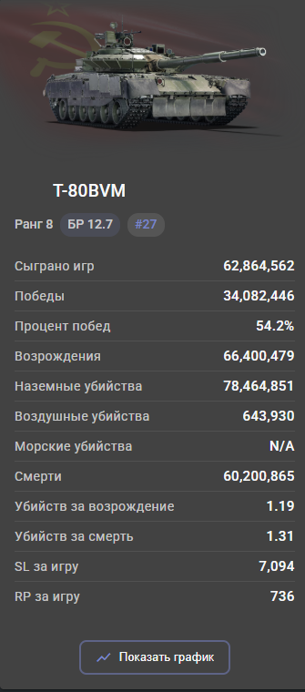 >>50517485 Ты же понимаешь что БВМ имеет топ количество игр? На нем сыграли почти в два раза больше игра чем на топ 2 месте по играм (а это 2а6), при этом на танке кд 1.31. Представь что бы показывал по стате этот танк если бы на нем не накатывали по 2кк игр в месяц пивные трапы. А представлять не надо, ты пример сам скинул, те же леопарды других наций, на которых играют по 200-300к игр.
