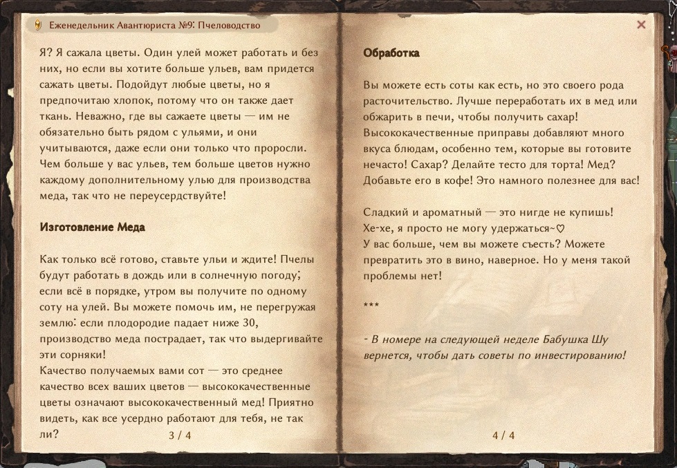 А я тут давеча у Искателя, что в северо-западных снежных пердях затарился бесплатными книжками и мне выпало вот это вот. Какая же пидарасня в игре с выдачей информации. Вот почему я не мог у любого фермера узнать что ульи хлопок считают за цветы. Как я вообще мог об этом даже подумать, еслиб мне не попалась книжка? Не говоря про лимит в 30 фертильности, но на это я уж точно забью, тк мне столько мёда не нать. Ща погуглил: пчелы ирл действительно могут опылять хлопок, но самому хлопку это не нужно, он самоопыляющийся.