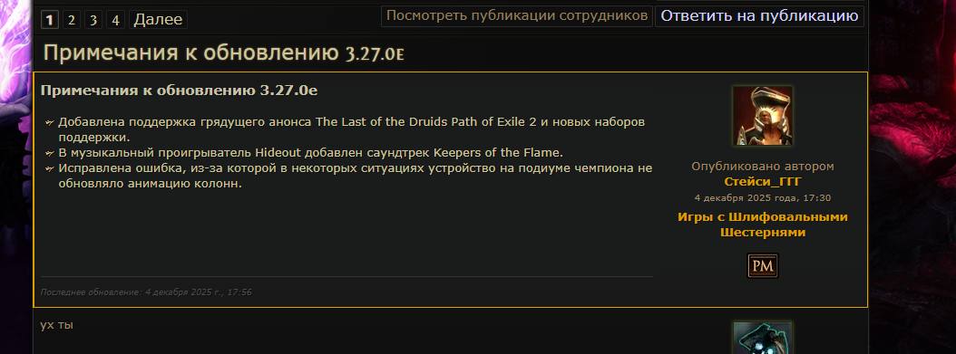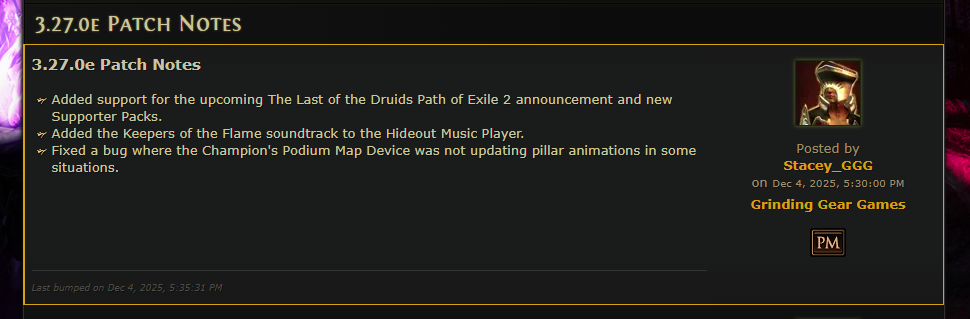 >делириум дающий паксайз и лут уебали >общий паксайз нах послали >кванту с табличек обоссали >все боссы теперь имеют снижение входящего урона в течении 15-20 секунд >друид медленное комбо дерьмо для аутов чей потолок белые т4 мапы и для них такой геймплей это ахуенчик самое то на недельку >крафт ослабили удалением некоторых оменов и ослаблением эссенций >рарити понерфлено + в 0.5 будет полностью удалено