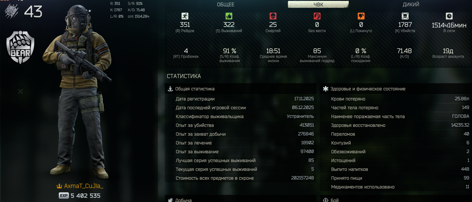 >>50527458 > если сложно то иди в ПВЕ Плохой совет. ПвЕ вырабатывает отвратительные привычки от которых потом тяжело отучаться и будешь страдать в пвп. ПвЕ не даст реального опыта игры, но создать ложное впечатление об игре и наработает вредные навыки. Изучать карту, квесты и выходы можно в режиме тренировки где нет врагов и так далее. Но именно ИГРАТь нужно сразу в ПвП. Вот, например, мой ПвЕ профиль. В пвп я был абсолютнейшим слабаком и казуалом, который еле-еле выживал и еле убивал ботов. ПвЕ СЛИШКОМ лёгкое по сравнению с ПвП и заставляет тебя чувствовать себя супергероем, что потом будет ОЧЕНЬ вредно в пвп.