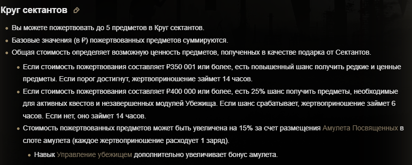 >>50540669 >по мнению Бубы Хорошее уточнение. За 8- или 12-часовое ожидание культисты часто приносят хорошие броню, пушки, пачки патронов и прочий ценный хабар, причем несколько вещей сразу. За 14 часов приносят один подствольник или забрало для маски-1щ или пачку MAI AP или вообще патроны .338 LM. Кстати если прокнет 6 часов, но для квестов или убежки ничего не надо, то культисты просто принесут как за 14 часов ожидания. И да, военную гофротрубку, усилитель GPS и контроллер тока они не принесут.