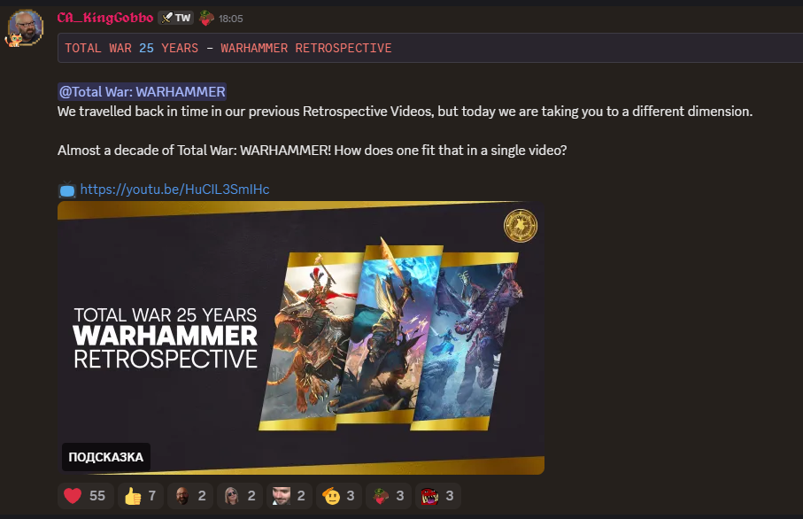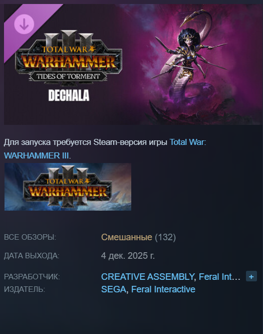 Warhammer 3 1) Анонсировано новое длс Lords of the End Times с НАГАШЕМ!: https://www.youtube.com/watch?v=jPIpN9OKKR4 Обещают летом 2026 года. 2) Вышло ДЛС со Слаанешем Tides or Torments. Лорды: Дечала Отвегнутая (Слаанеш), Сейл Вероломный (Норска) и Айслинн (высшие эльфы). Бесплатный лорд для всех - Маска (Слаанеш). 3) Для тех, кто вкатывается после долгого перерыва в игру - патч 6.2 был ОГРОМНЫМ по размерам (аж 55 гигов) и перелопатил все файлы игры, так что придётся потерпеть долгую закачку и установку. Зато после него размер игры снизился примерно на четверть и загрузки в самой игре станут побыстрее.