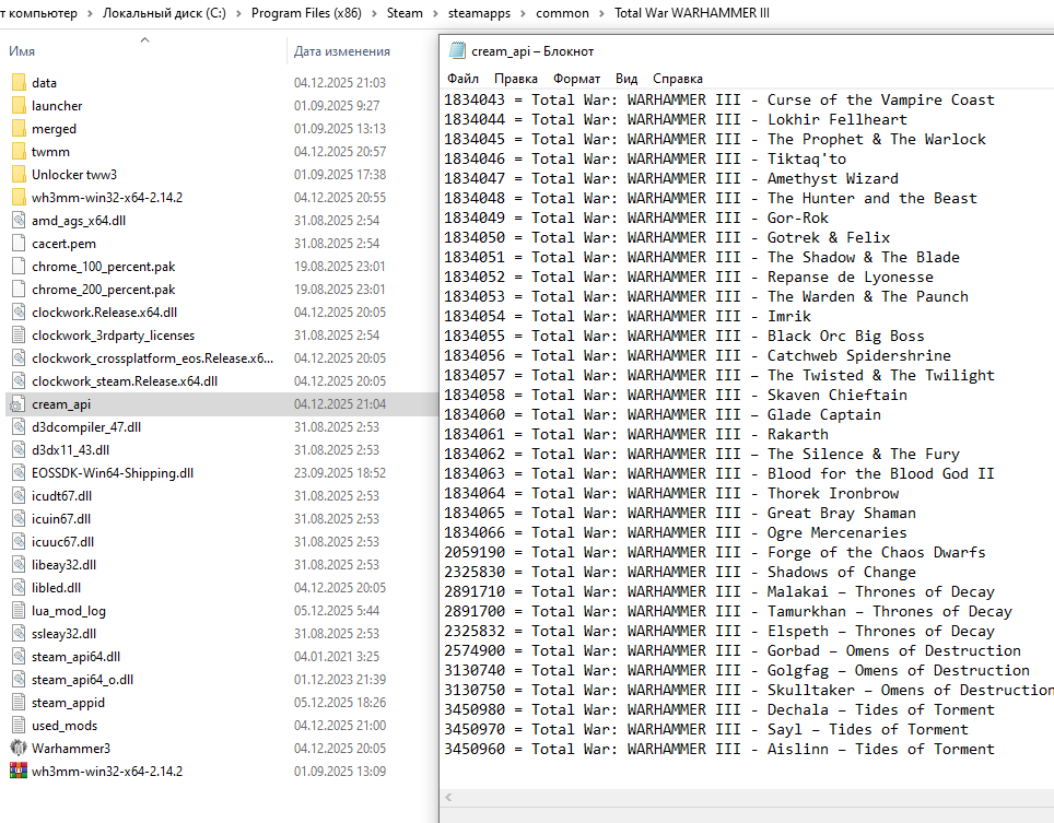 Как заломать ДЛС для трёхи кремом (краткий нубогайд edition): 1) Выйти из игры и закрыть стим. 2) Открыть папку Steam\steamapps\common\Total War WARHAMMER III 3) Найти файл steam_api64.dll и забэкапить. 4) Распаковать файлы из архива wh3.zip в папку Steam\steamapps\common\Total War WARHAMMER III. Согласиться на замену файлов. Сам крем: https://www.mediafire.com/file/wp5p84j1s04b6nm/wh3.zip/file Обновлён под патч 7.0 Если из-за патчей опять протухнут файлы крови, и юниты\оружие юнитов в игре станут невидимыми - клянчите обновку у анонов в треде. Также в ожидании апдейтов можете просто отключить кровь в настройках игры. ВНИМАНИЕ! Крем ставить ТОЛЬКО из шапки, либо от анонов итт! Взяли его откуда-то ещё и он не работает? Идите нахуй и выясняйте всё там, где взяли, не ебите мозги треду.