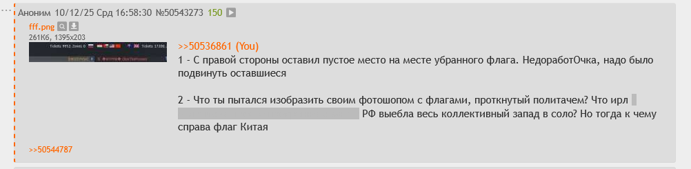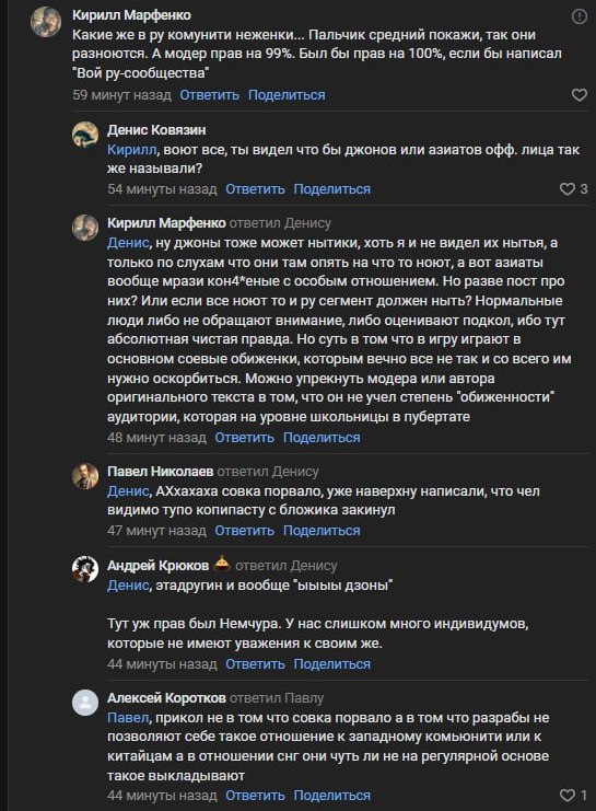 >>50544917 Бля, вот это джоны крутые и дружелюбные, лолбля. Каждый раз вспоминаю сколько в лс стучалось этих самых "дружелюбных" джонов, обвиняя меня в читерстве, сколько они "добрых" и "теплых" словом про меня писали. Сколько играл на разных регионах, разница минимальна, и когда вот такое вот проткнутое снг менталитетом чудо вылезает, просто ахуй берет. Причем, что самое смешное, свое ощущение выдавая за базу.