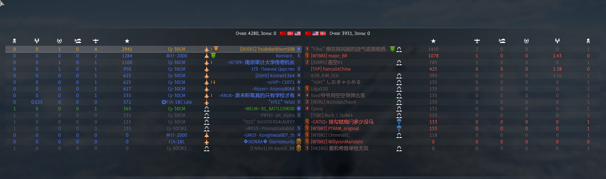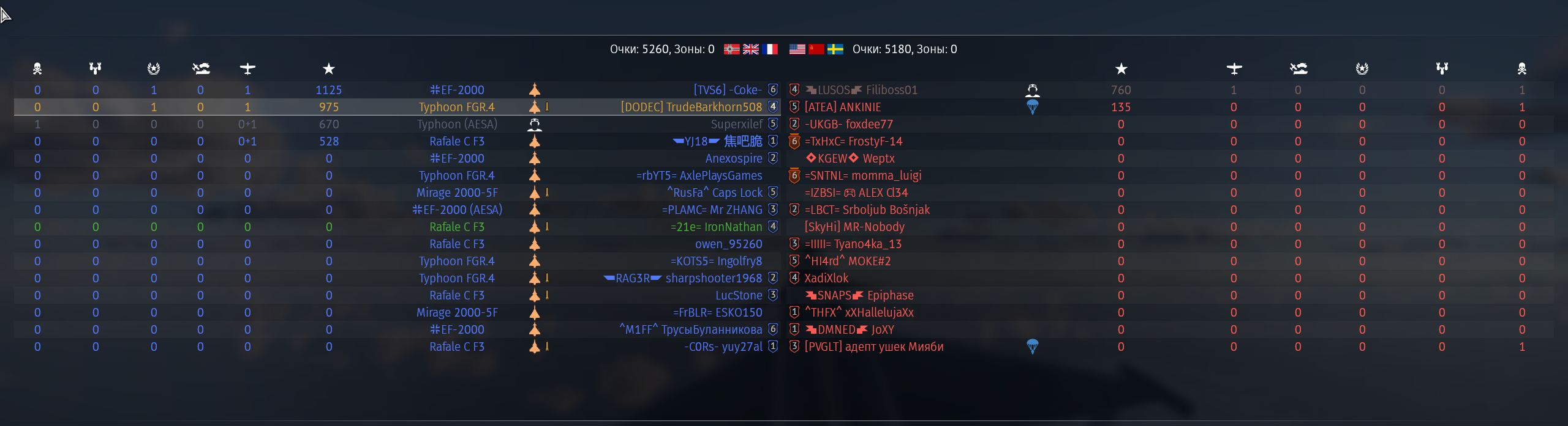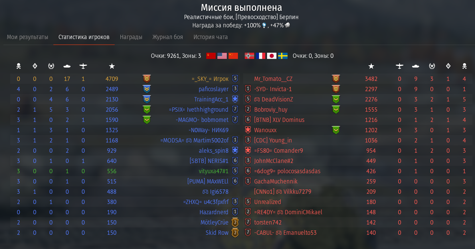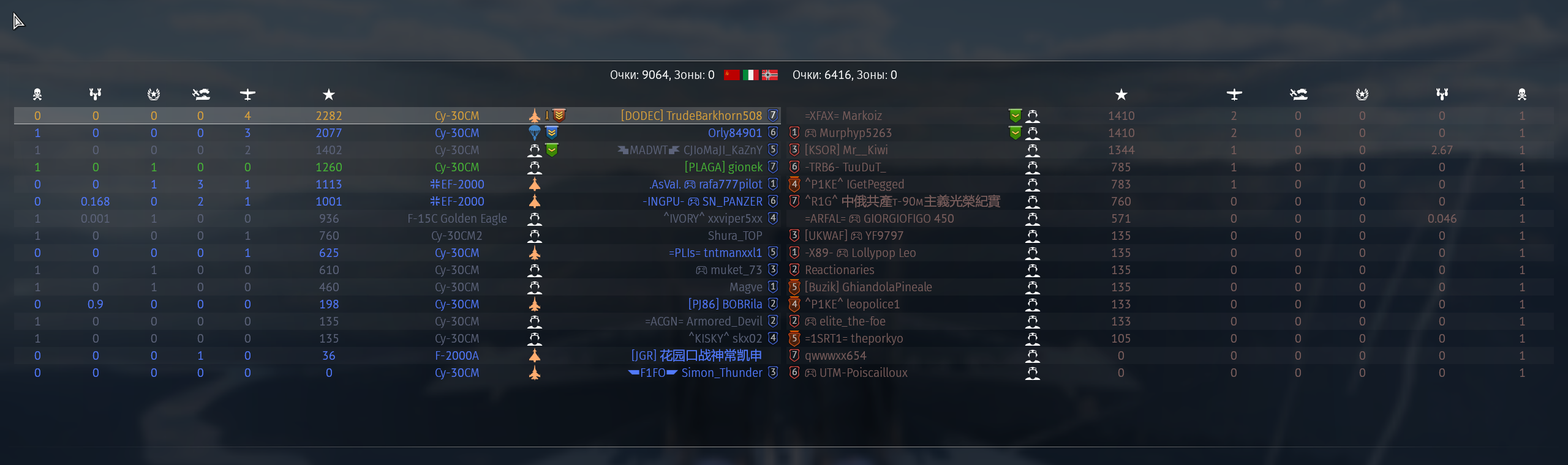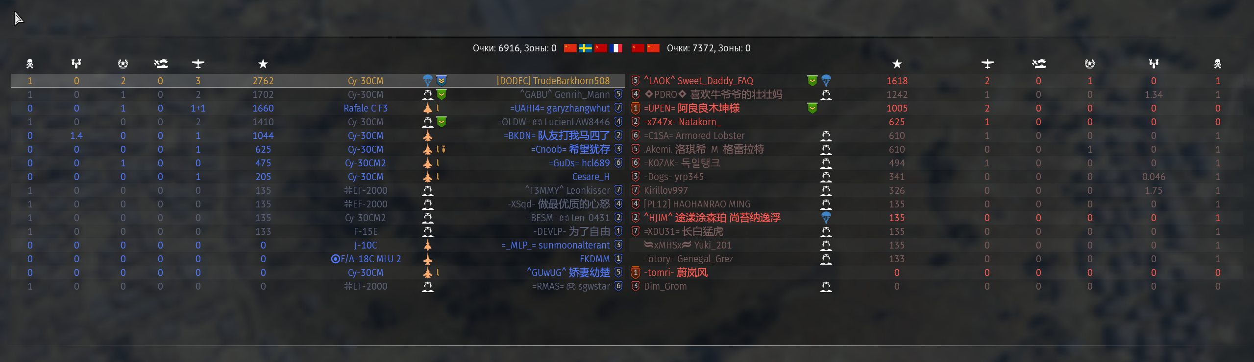 Знаете почему с правой стороны нет уже синих флажков? Правильно - они все сдохли. Алсо зацените эффективность тайфунов в нашей команде. А вот конец боя. ТУпо СМ-30 и Рафаль. Угадайте что у них общего? Правильно, у них ракеты вместо амнямов. Ракеты по таймину залетевшие в течение 3 минут после старта боя +-10 секунд - это ракеты пущенные в промежутке 30-40км.