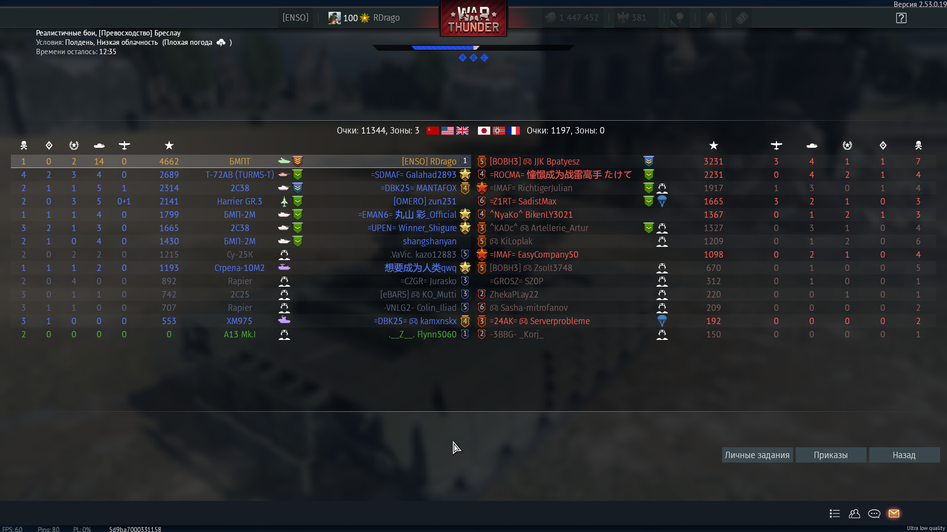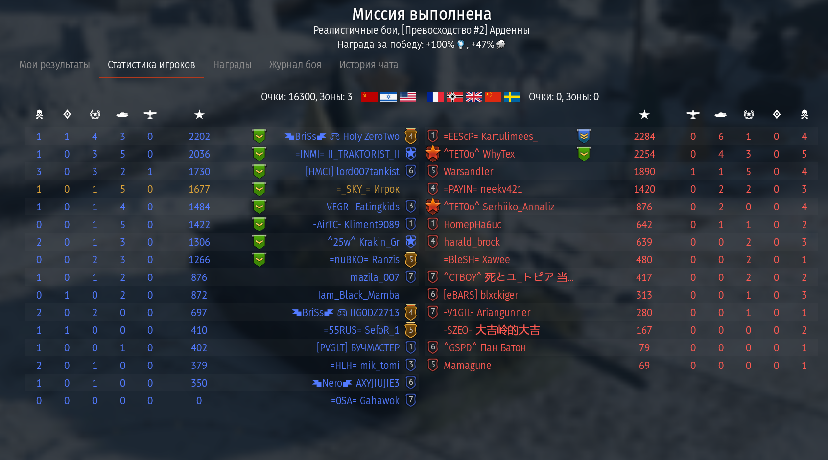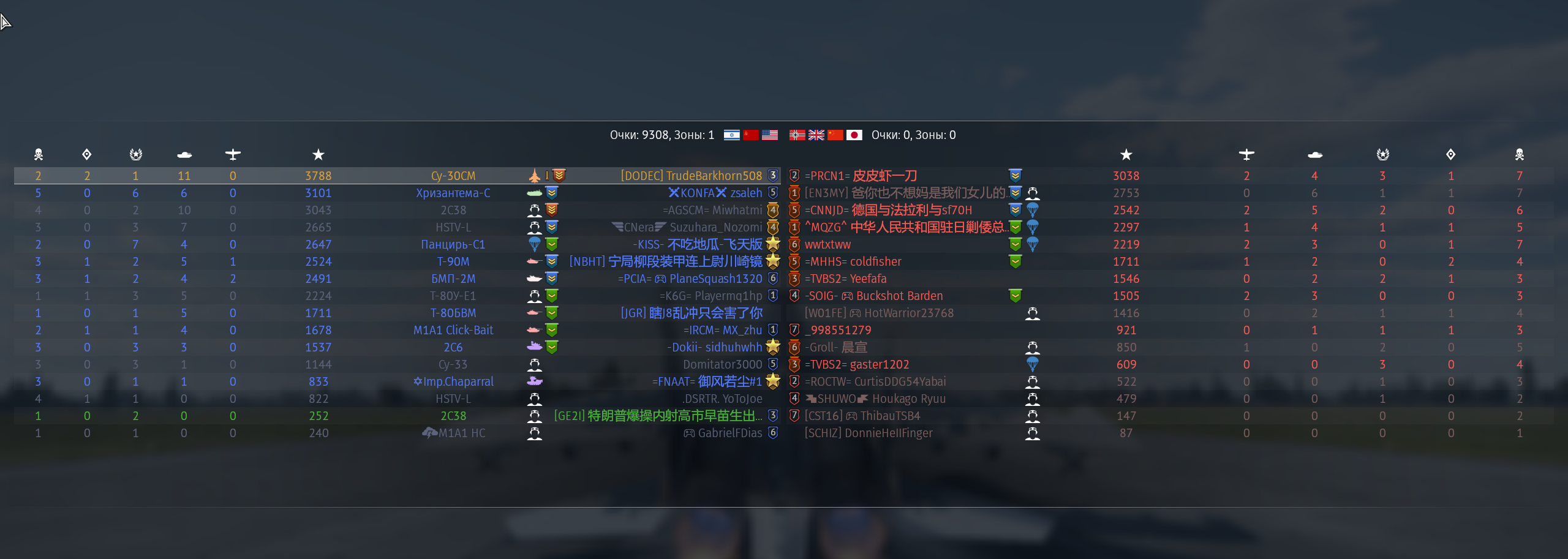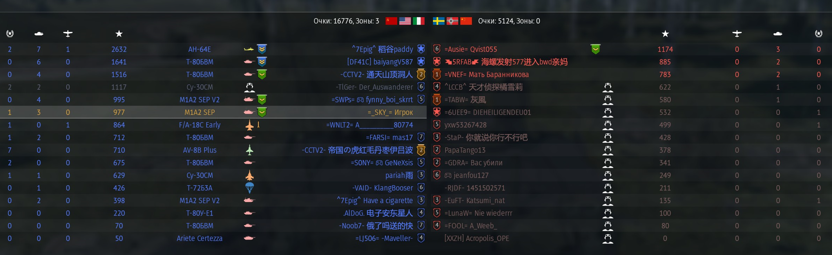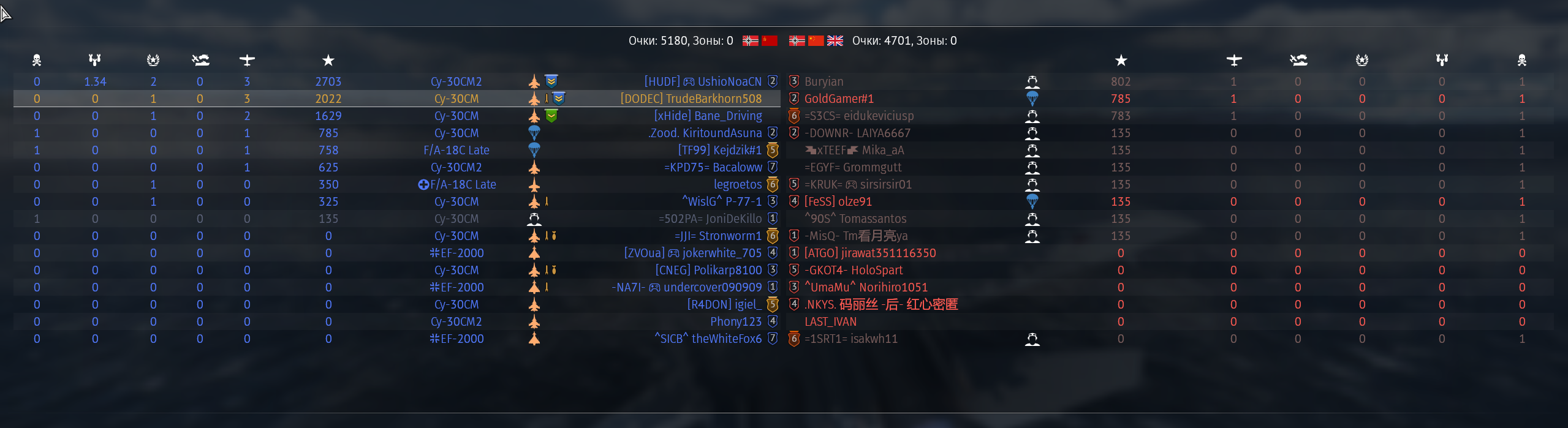 Знаете почему с правой стороны нет уже синих флажков? Правильно - они все сдохли. Алсо зацените эффективность тайфунов в нашей команде. А вот конец боя. ТУпо СМ-30 и Рафаль. Угадайте что у них общего? Правильно, у них ракеты вместо амнямов. Ракеты по таймину залетевшие в течение 3 минут после старта боя +-10 секунд - это ракеты пущенные в промежутке 30-40км.