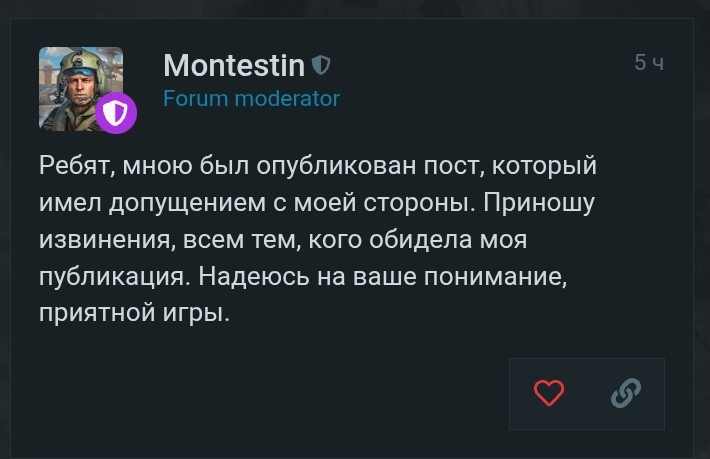 >>50541277 Откладываю этот калл на самую последнюю очередь к прокачке, с месяц назад попробовал т80 на 11.7, сблеванул и дропнул, вроде даже тройку не выдавив но и из стока не вывел еще. Сегодня вот решил еще раз, но уже на т90, вот тут получше, но это скорее потому что бр ниже. Чем ниже бр тем проще играть, а этот на 11.0 еще и в топ часто попадает. Увн нет, заднего нет, скорости наводки нет, вертикальная ваще пиздец. Ничего из необходимого для комфортной игры нет. Но броня есть. Полагаться на нее нельзя, но она есть. Порой тебя обэмы от холма давят, ты со своими 4.5 увн не можешь даже близко на них навестись, но и они раз за разом не пробивают. Это и есть вся совковая фича. Помолится что враг обосрется, а потом его убить. А еще, видимо, игра на совках сразу понижает айсикью на 50, чтобы броня работала, сотни раз езжу по одним и тем же картам на одни и те же места, но стоило взять совка и я на похую вываливаюсь за угол, философски рассуждая нахуя я это сделал, если знаю что так делать нельзя. Меня принимает в борт враг, я танкую бачком и убиваю его. Совок эт итс файнест.