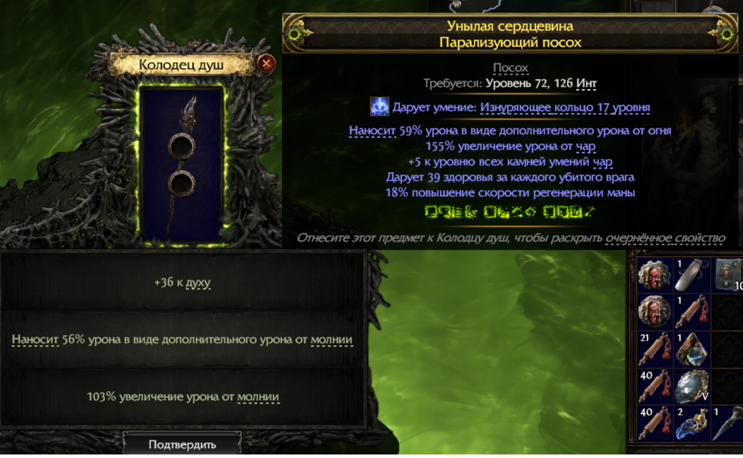 Крч выпилил я тушку, теперь есть около 60 духа свободного от груди с базой на дух Вариантов 3, Ставить богохульство на проклятие стихии Ставить подрыв на автокаст ( будут сгустки доп ) Ставить тоже подрыв только от вызова стихий Я НЕ СОВСЕМ ПОНЯЛ РАЗНИЦУ МЕЖДУ ( ВЫЗОВОМ СТИХИИ ) и ( НАЛОЖЕНИЯ СТИХИЙНОГО НЕДУГА ) И еще вопрос, можно ли как то контрить вот этот урон по себе, потому что сука от +5 ко всем скилам по сути вообще не хочется конечно отказыватся, хотя если дефенса не будет, всеровно придется на просто рарити амуль перейти с ес