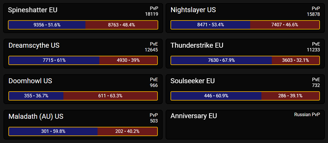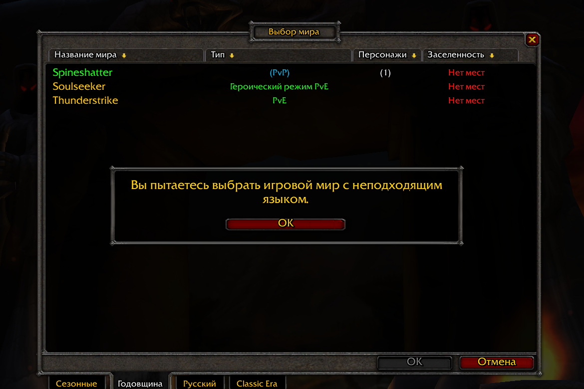 Не выдержал я игры на годовщине (ру). Да, есть атмосфера загадочная такая локального сервера интернет-провайдера с маленьким онлайном, русский язык тоже приятно, все сундуки+рарники твои, а встреча и пати с живым игроком это приключение (редкость). Но я не могу без аука нормального, как будто кусок из игры вырвали. Пламегор вот вполне себе был населенным, а эта годовщина вышла залупой на 200 русичей. Буду играть на тандерстрайке