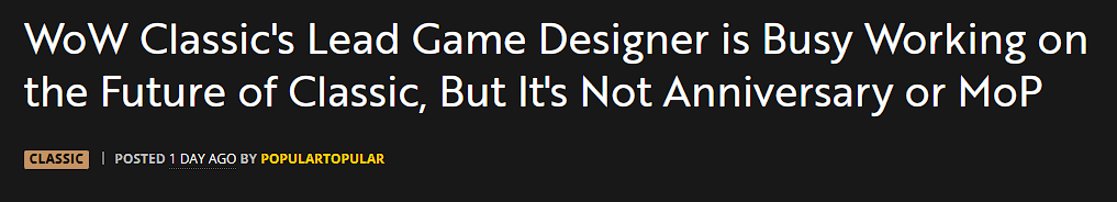 >>50618253 13 января пре-патч БК на серверах анниверсари. 2-3 недели и релиз БК. Ванилла - все. Вряд ли она когда-то будет еще, за исключением вов классик +, который будет "новым домом" для любителей классического мира со слов разрабов.