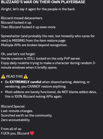 Не ну близзы гении, я разгадал их план! Они специально запускают тбкал одновременно с миднайтом чтобы задушившиеся от калсического экспириенса пошли покупать аддонис. Лично я так и поступил, уверен таких как я много.