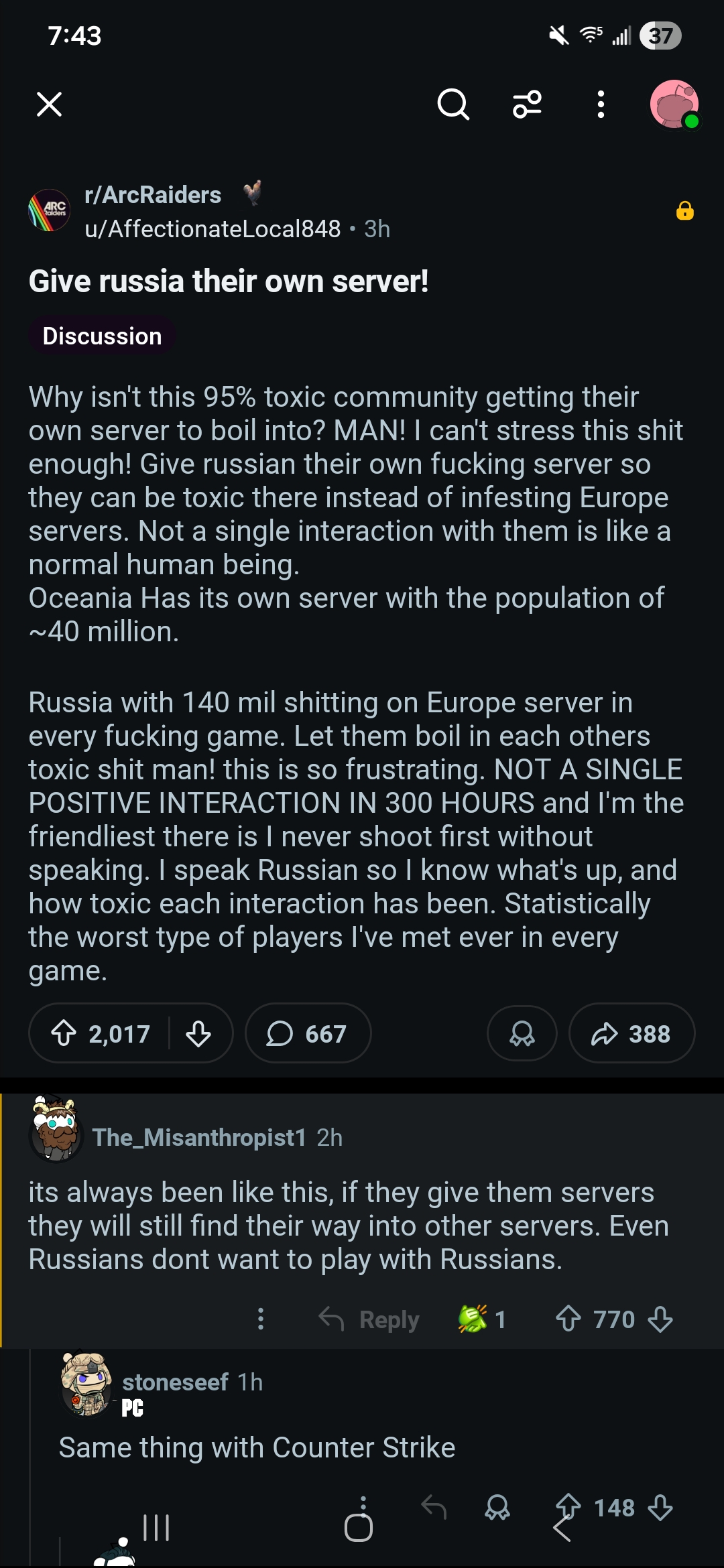 >>50545111 Пинг высокий. Перманентно 1-2 красных маркера сбоку экрана. Одна ходка еще терпимо было. На второй перманентные статтеры и перс аж останаивливается и назад на шаг-два телепортится. ВОзле лифта из ниоткуда появился немой чел, пробежал мимо, развернулся и сбрил с венатора. Сев. Америка не панацея.