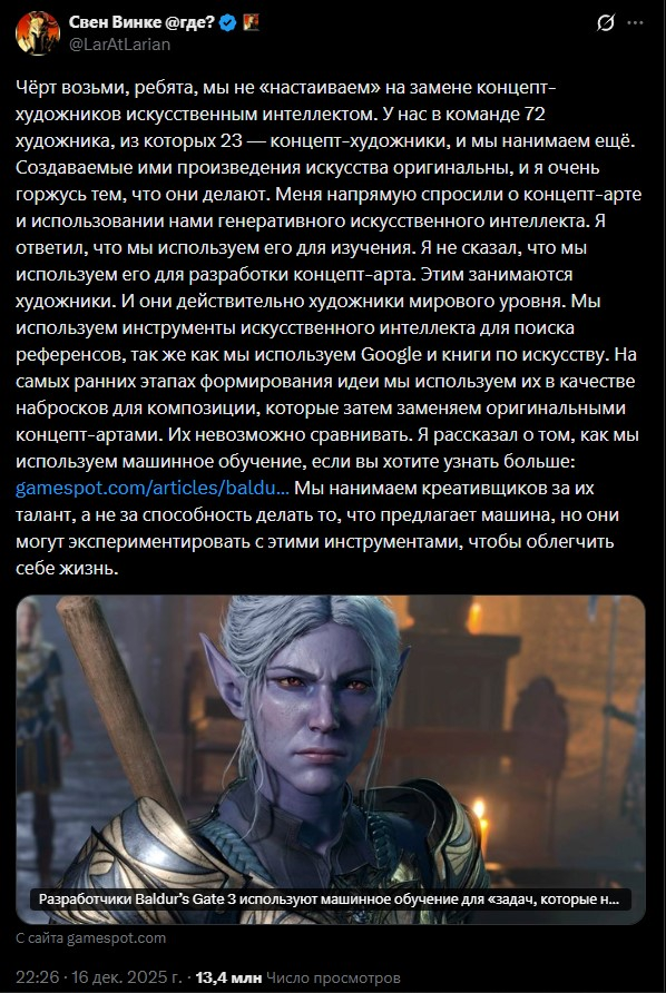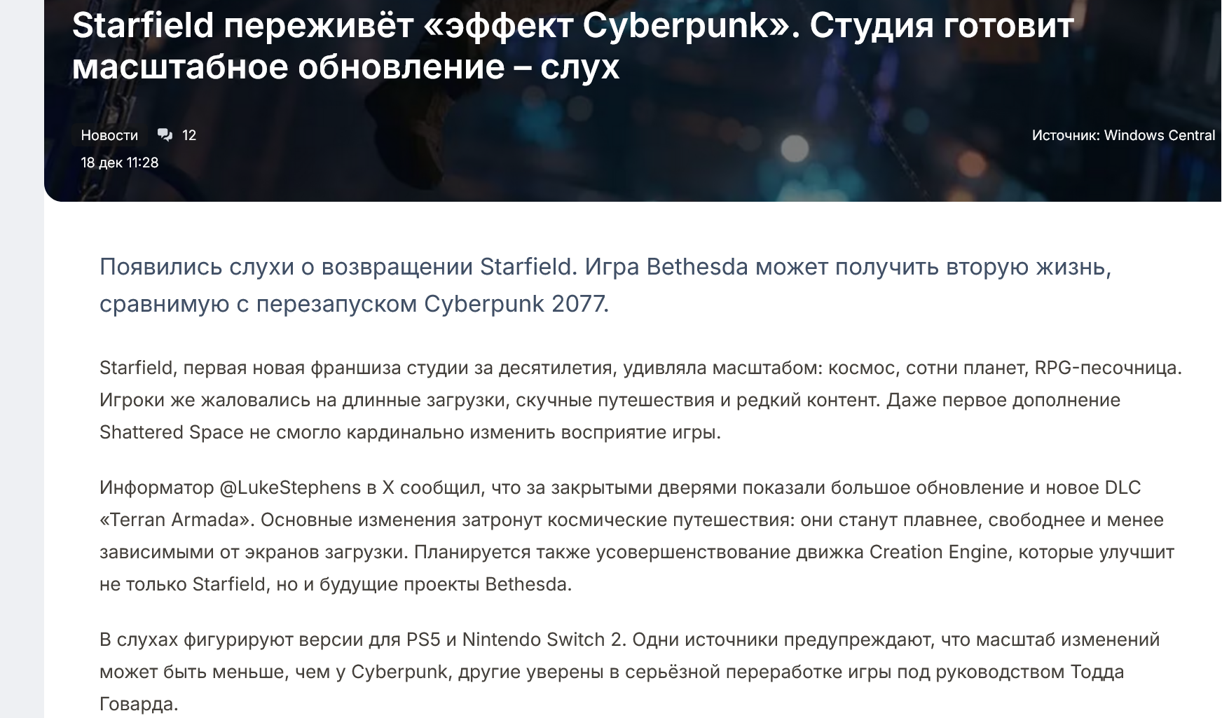 Вот честно я даже не думал что тодда настолько сильно унизят и настолько сильно нассут ему в рот, нового длс настаркалл нет, зато заанонсили новые ЗВ, потеницально топ рпг про космос, ибо продолжение топовых рпг зв старая республика из нулевых, Свен Гигачад Винке заанонсил новый топовый винчик который ждет теперь весь мир ибо очевидно будет шедевр как оба ДОСа и БГ3, и финальный удар по кучерявику это та самая БГ3 до сих пор продолжает собирать награды